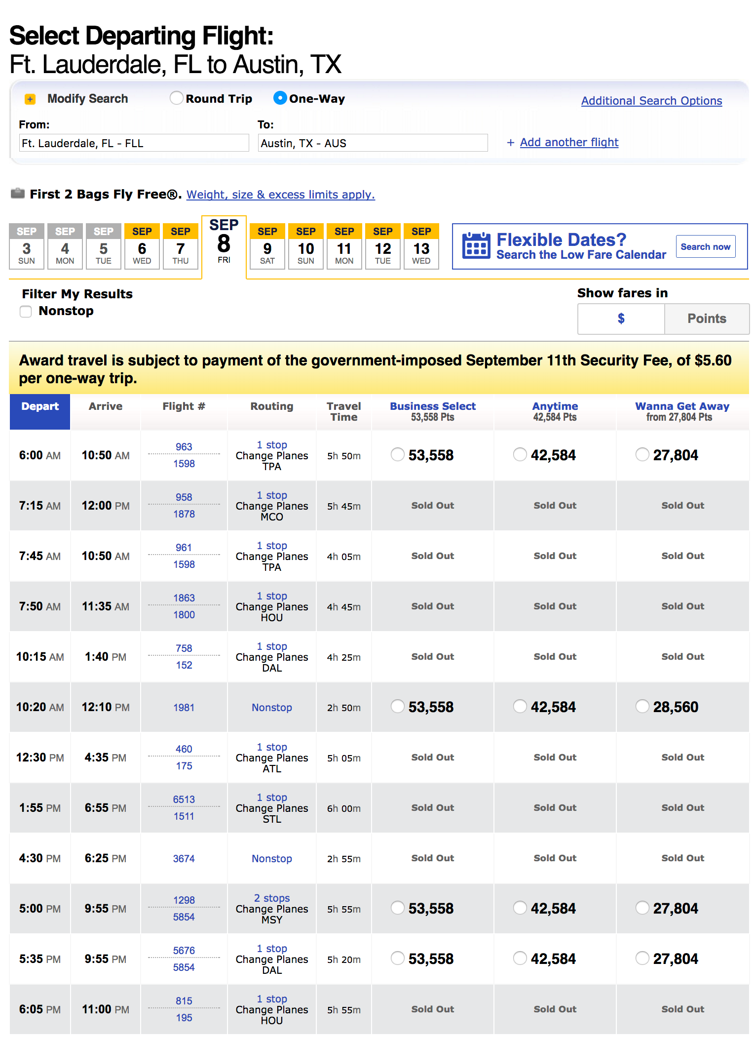 There are also award tickets available on Southwest's flights to Austin — though they're also on the steep side.