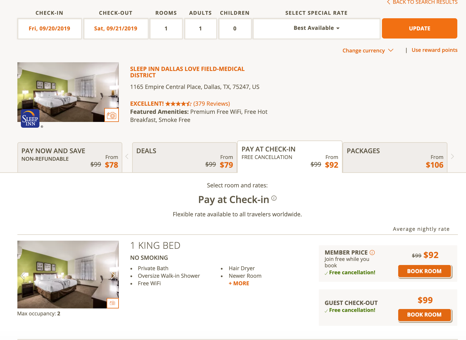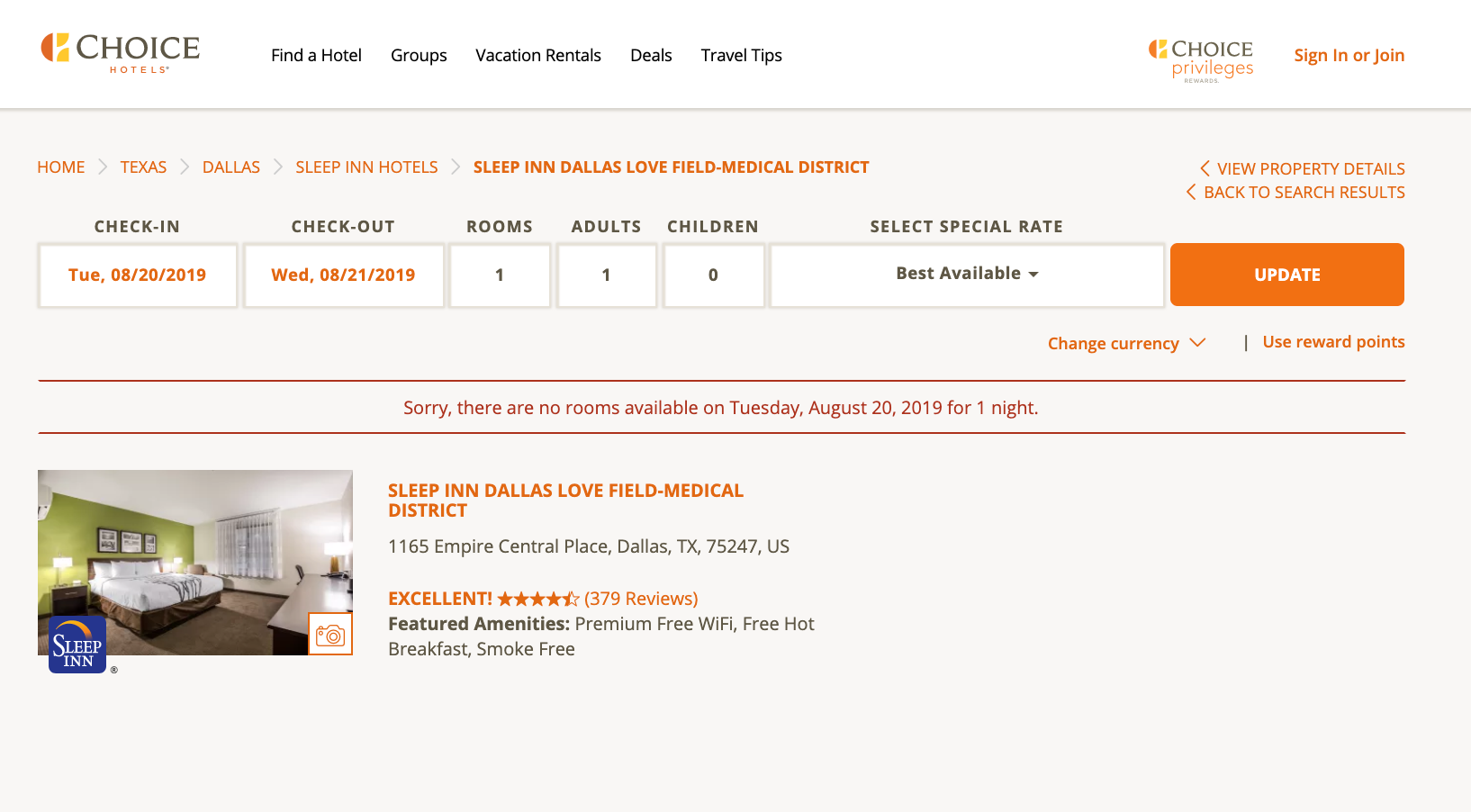 We didn’t see any price fluctuations over the course of the 10 hours when we watched the price of rooms for the Oyo Hotel Dallas Love Field or the Motel 6 Dallas Market Center for a one-night stay on Aug. 20. The Sleep Inn Dallas Love Field–Medical District, however, did sell out of its last remaining room over the course of the period when we watched prices.