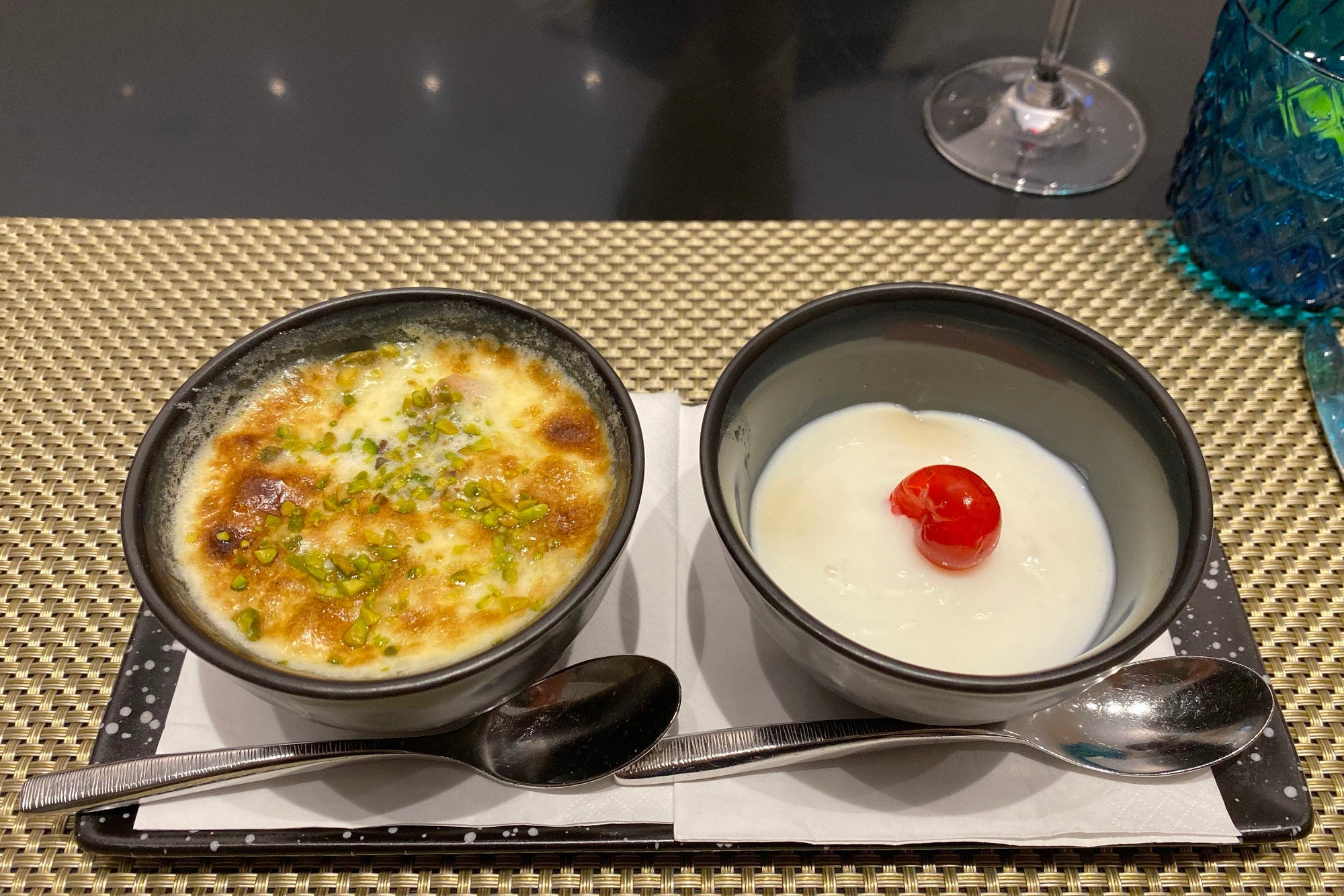 Though I wasn't blown away by the cuisine, the shrimp starter tasted fine, and the desserts were interesting — aish el saraya, a Lebanese bread pudding and umm ali, an Egyptian bread pudding.