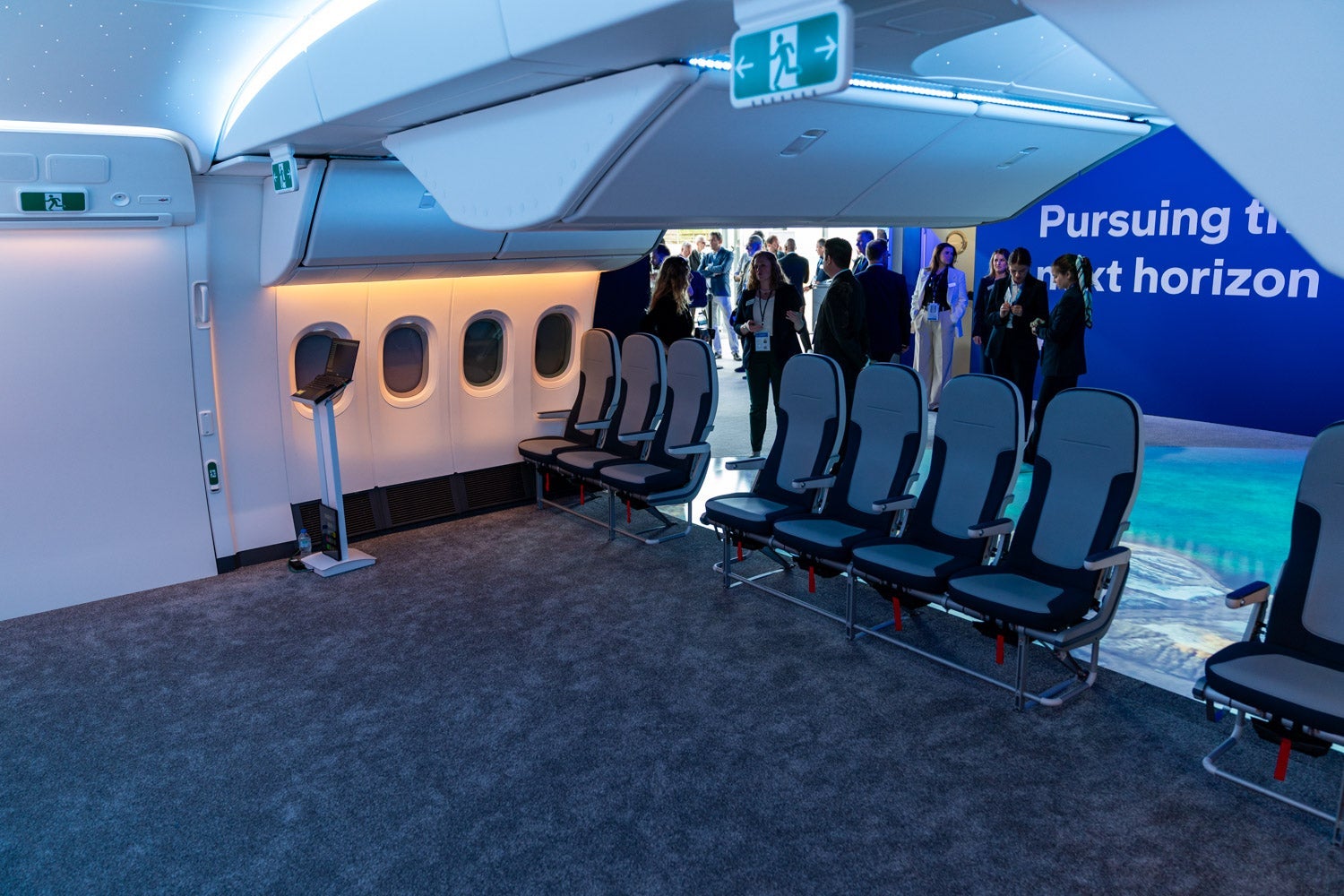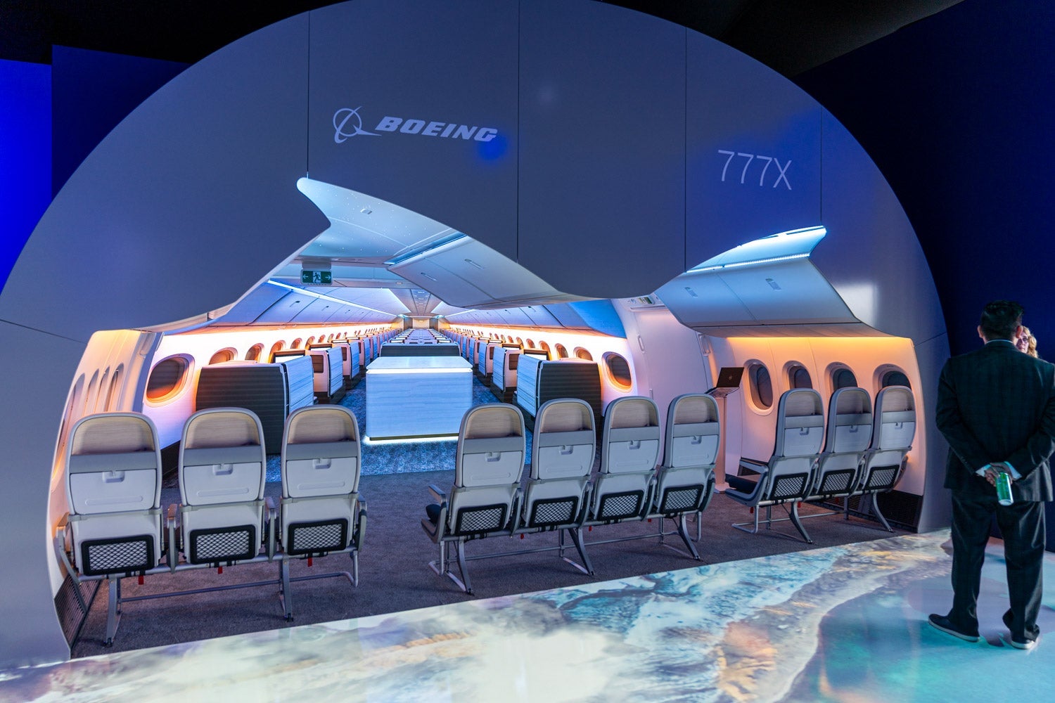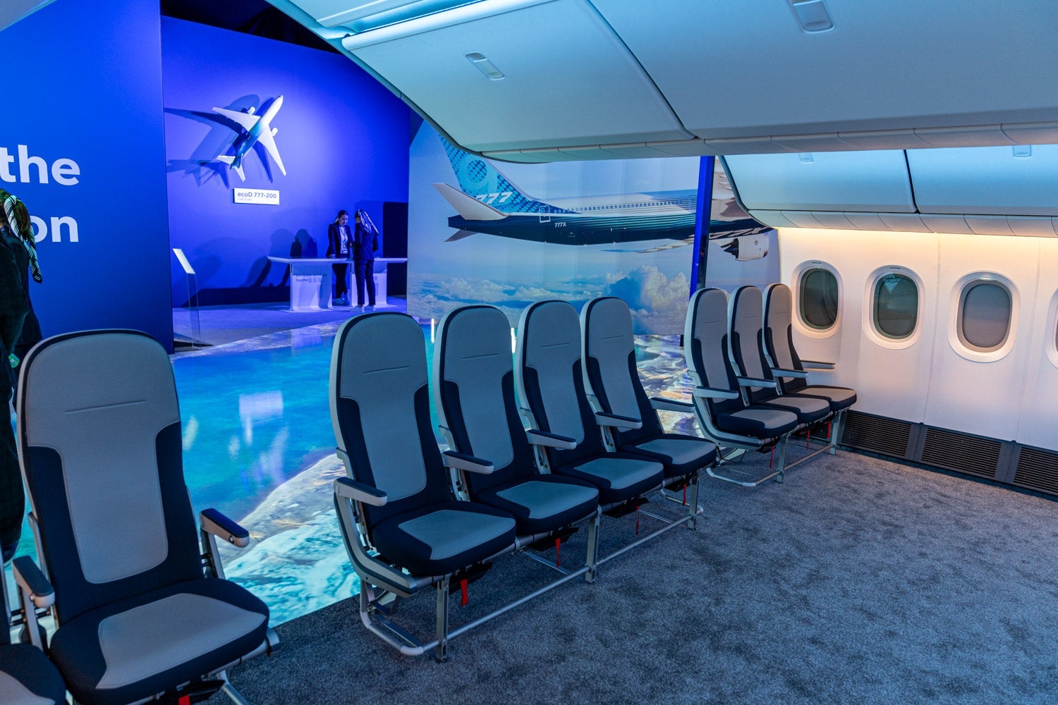Over at Boeing's display, a mock-up of the 777X cabin was on display, showing that while it will be wide and spacious enough to feel open and airy, like the current generation of 777, it will likely mean a tight 3-4-3 seating configuration on most carriers — again, like the current generation of 777.
