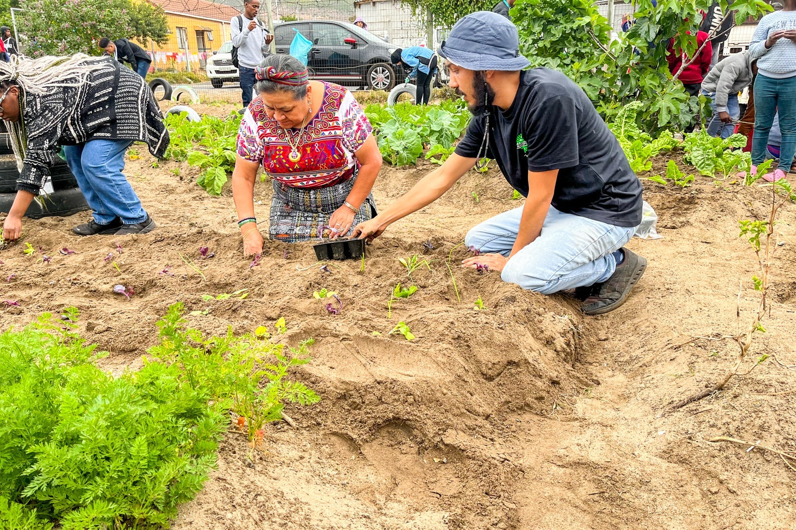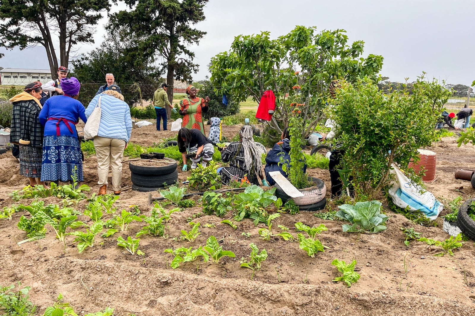 Mentors and students, along with the kids in Cape Town's Westlake neighborhood, painted an uplifting mural on the outside wall of an orphanage. Additionally, we met with Mama Lina, who established "Cultivating Good from Root to Fruit," a community garden that feeds her neighborhood. We planted vegetables and painted tires that lined the garden.