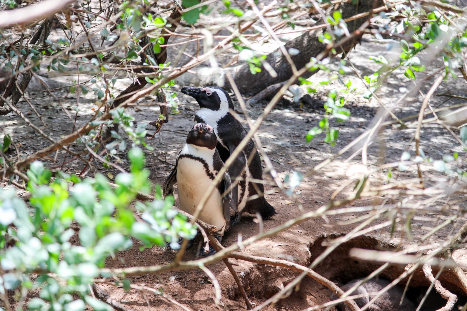 A boardwalk leads you down to the beach where huge boulders create sections of sandy coves. Most of the penguins that day were resting under the trees lining the boardwalk, but we were able to spy a few.