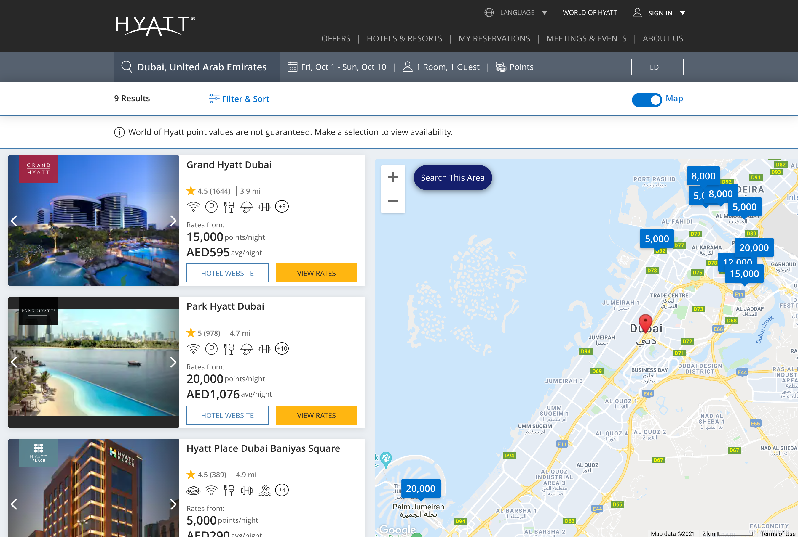- Hyatt Place Dubai Baniyas Square: 5,000 points per night.