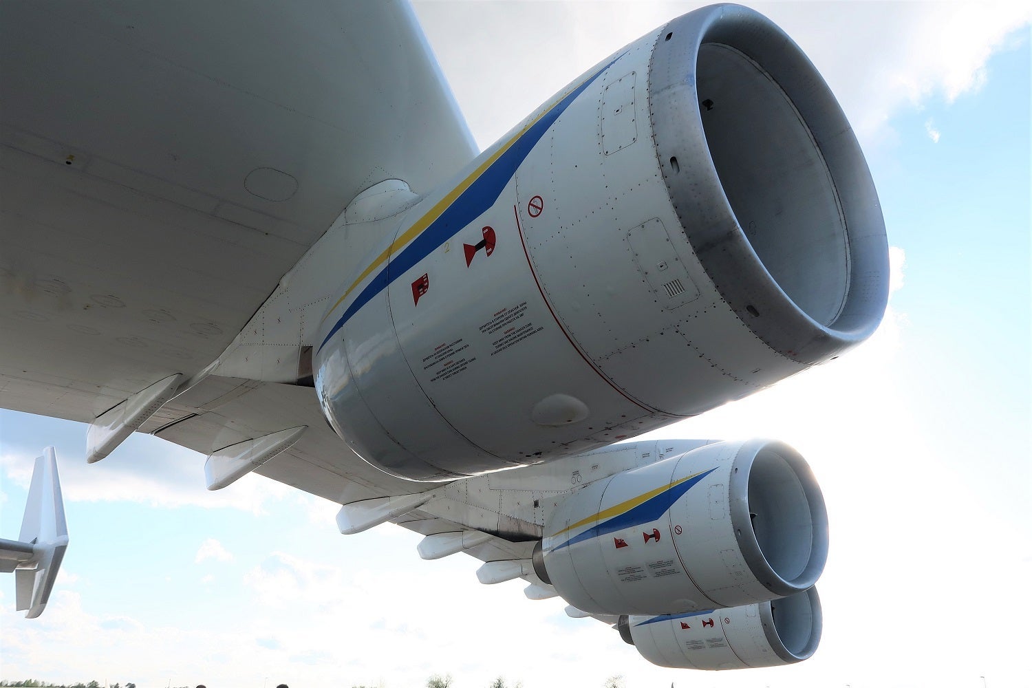 The aircraft is powered by six Ivchenko Progress D-18T turbofan engines — three on each side.