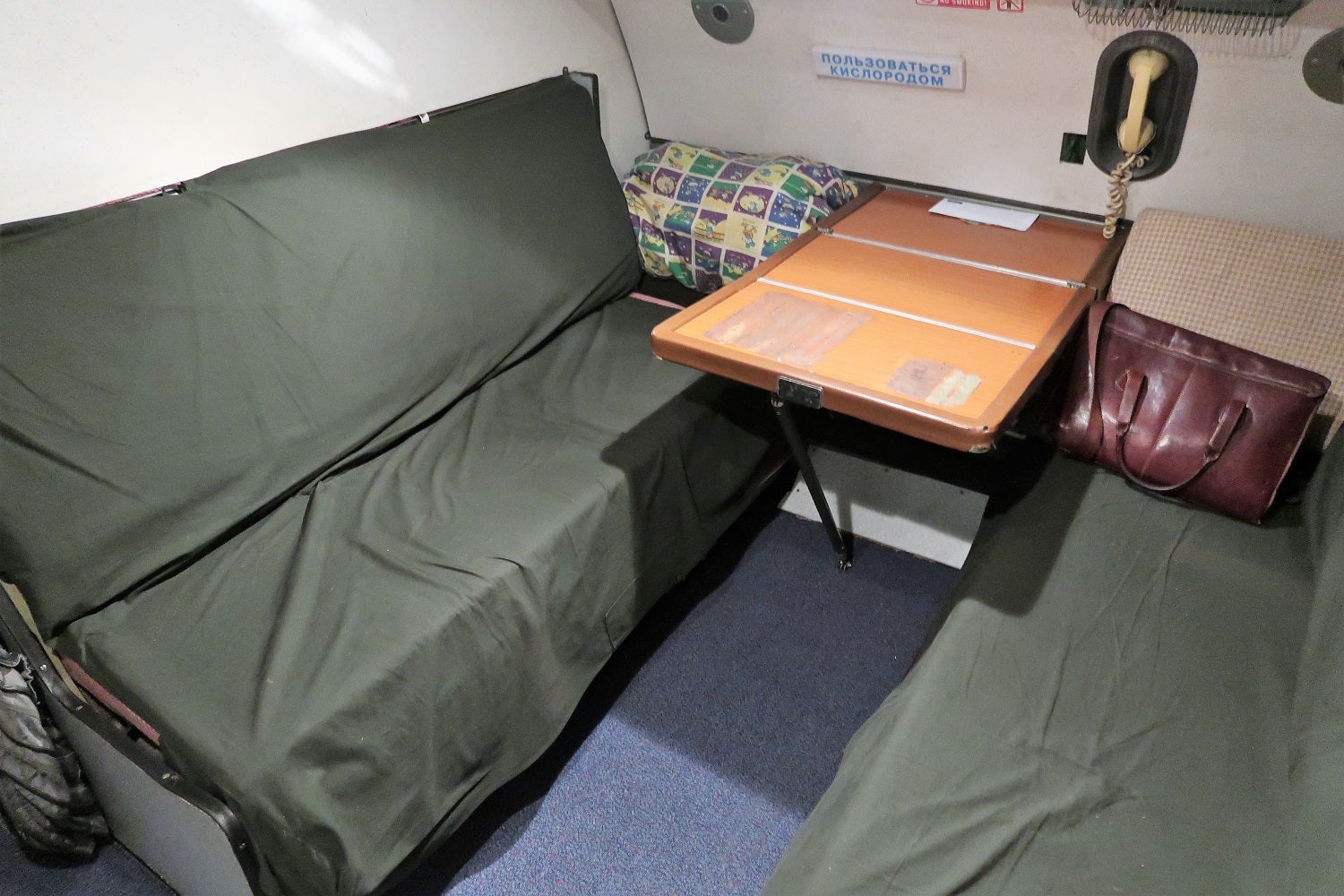 In a cabin behind the cockpit, pilots and flight crew have six bunks for rest. There are two mini-cabins with two stationary bunks and one bunk that can fold down over a table.