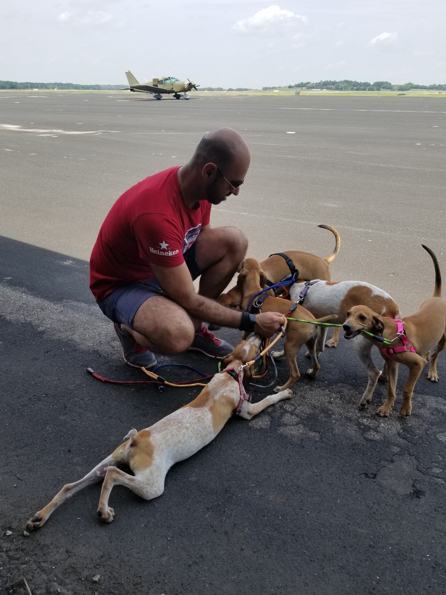 Seitan's feistiest rescue was the time he ended up with five dogs in one mission. "It was actually supposed to be six dogs," he said — "A mother and five mangy pups. Mom was a flight risk and everyone knew it, but she still somehow escaped at the airport in Kentucky. They found her a couple of days later, chasing birds at the airport." She was carefully rounded up, and safely transported to her forever home.
