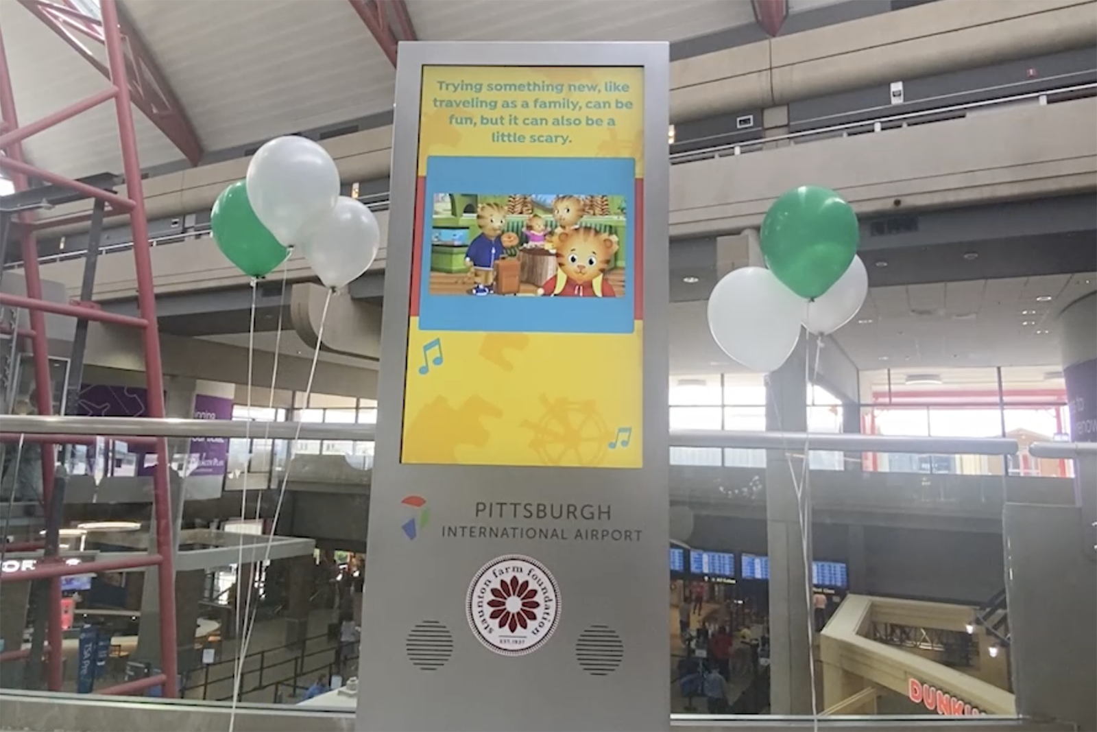 One of the screens is in PIT's Kidsport — a 2,100-square-foot interactive children's play area in Concourse C. This screen features messages from the Fred Rogers Productions preschool series "Daniel Tiger's Neighborhood," encouraging children to communicate their feelings to adults. The message also offers helpful suggestions for parents and caregivers on how to support young travelers.