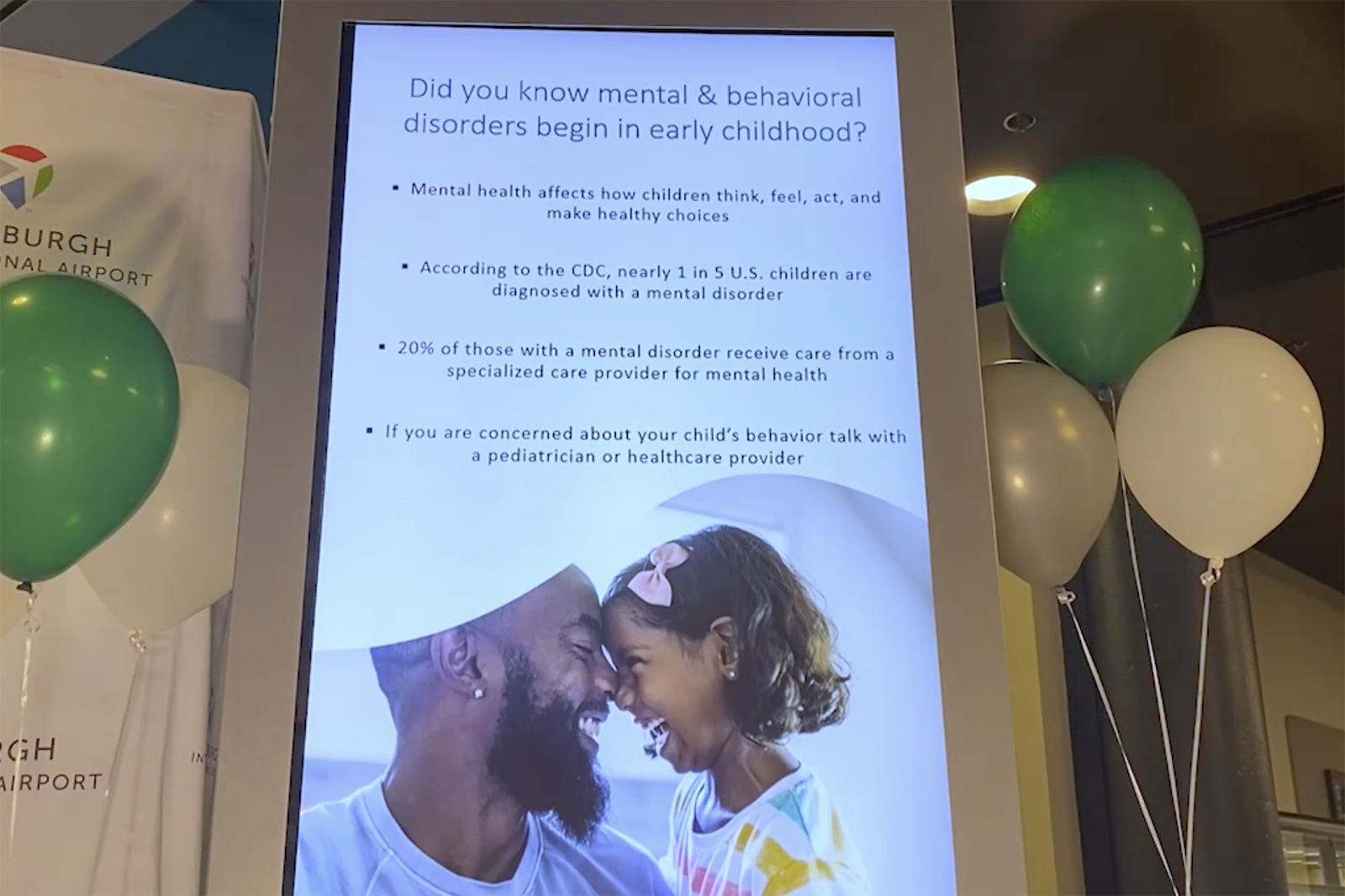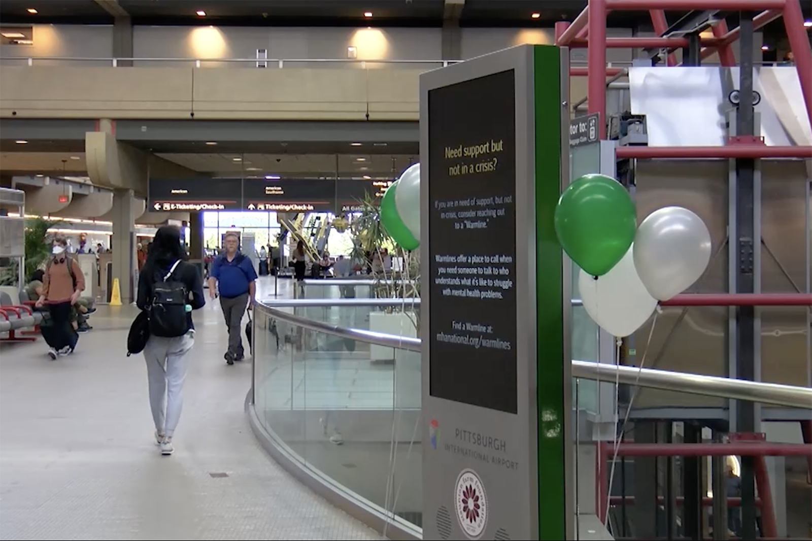 In concert with a variety of local community groups and organizations, Pittsburgh International Airport (PIT) installed nine digital monitors in the terminal offering video messages about the importance of mental health and offering resources for people seeking more information or assistance.