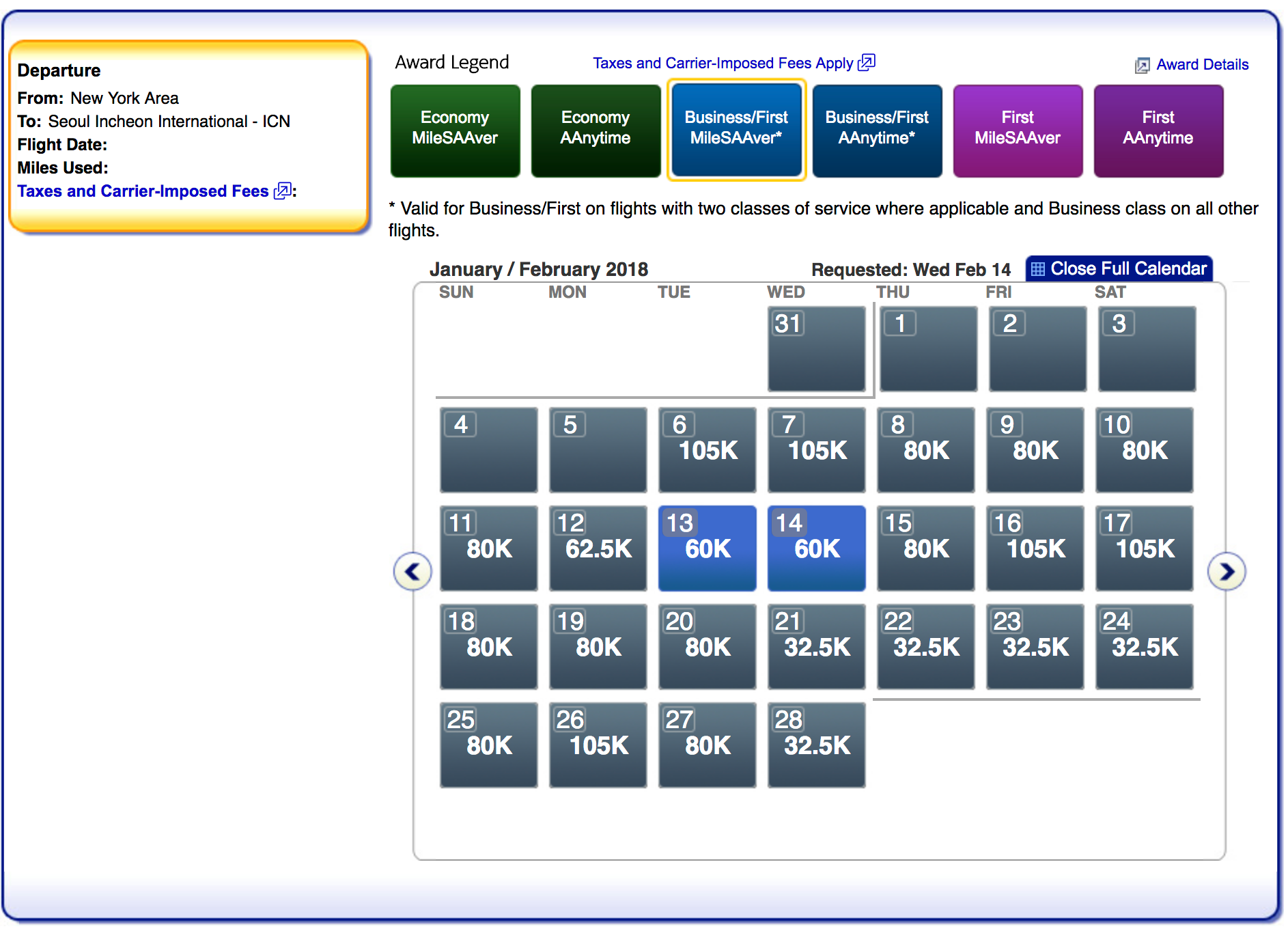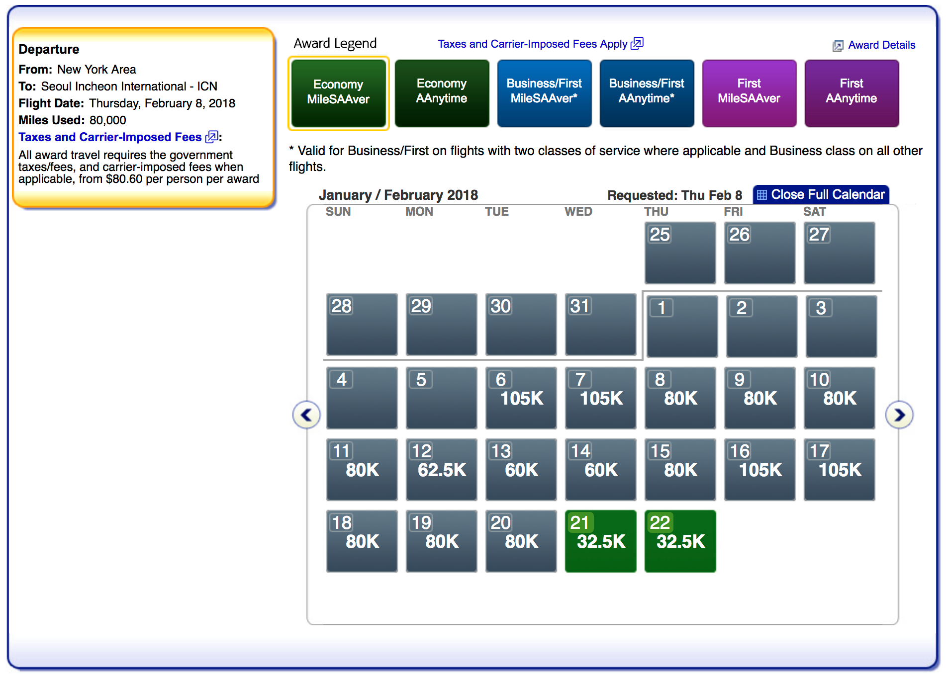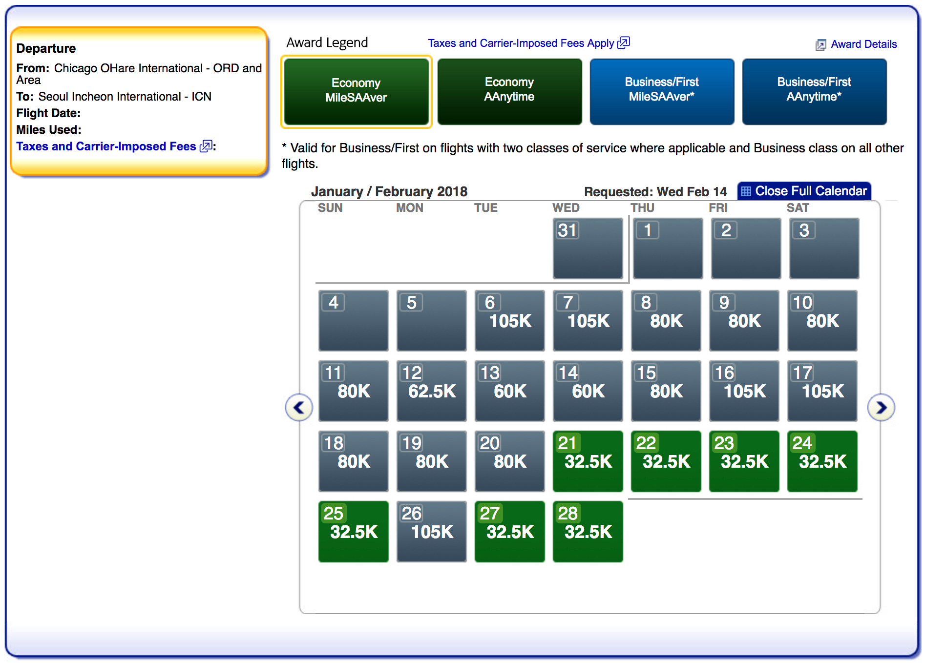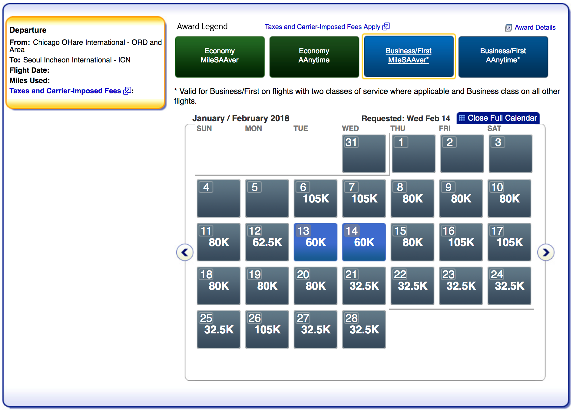 Chicago-based flyers have more options to make it to the Games in time — in both economy and in business at the saver level. Economy costs 35,000 miles one-way in economy or 70,000 miles one-way in business on the route with more availability throughout February.