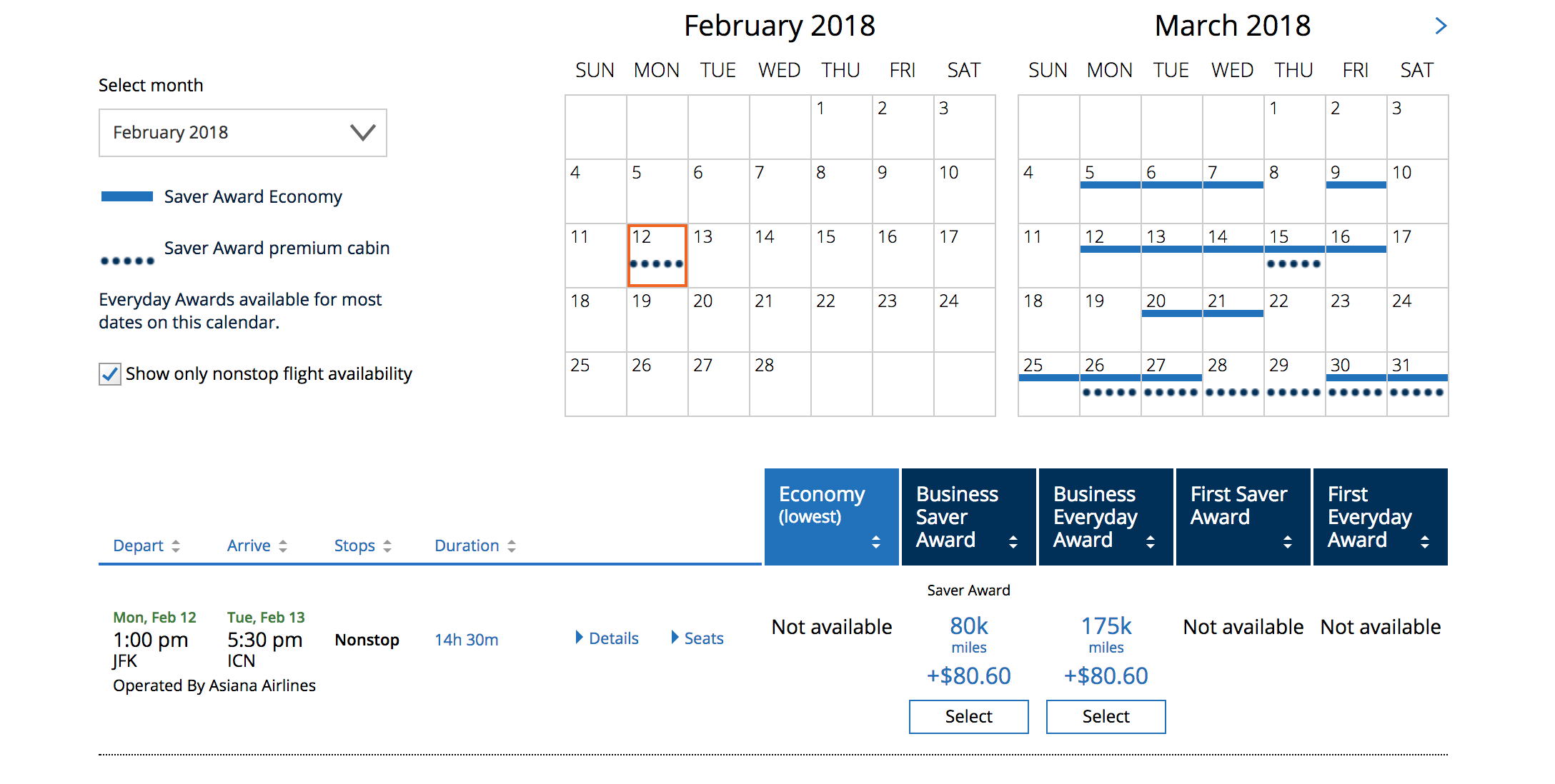On only one day for the month of February does United show any award availability from New York (JFK) to Seoul (ICN) — and its in business. Unfortunately, the one day of availability won't get you to South Korea in time for the Opening Ceremony, but you will have some time before the end of the Games. At the saver level, the one-way trip in business will cost you 80,000 United miles plus taxes and fees on a flight operated by Asiana.