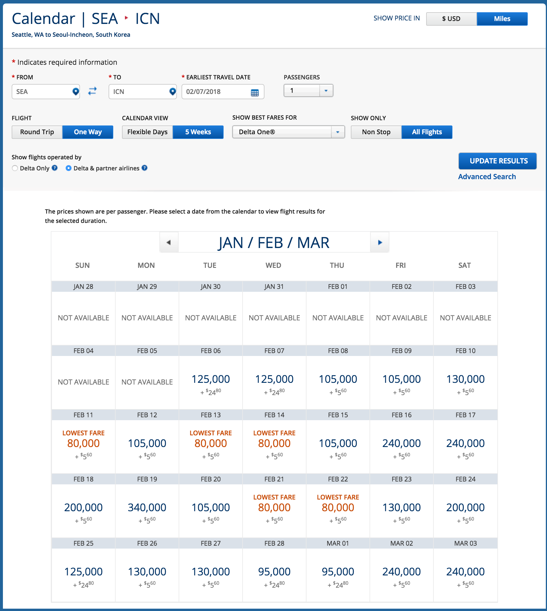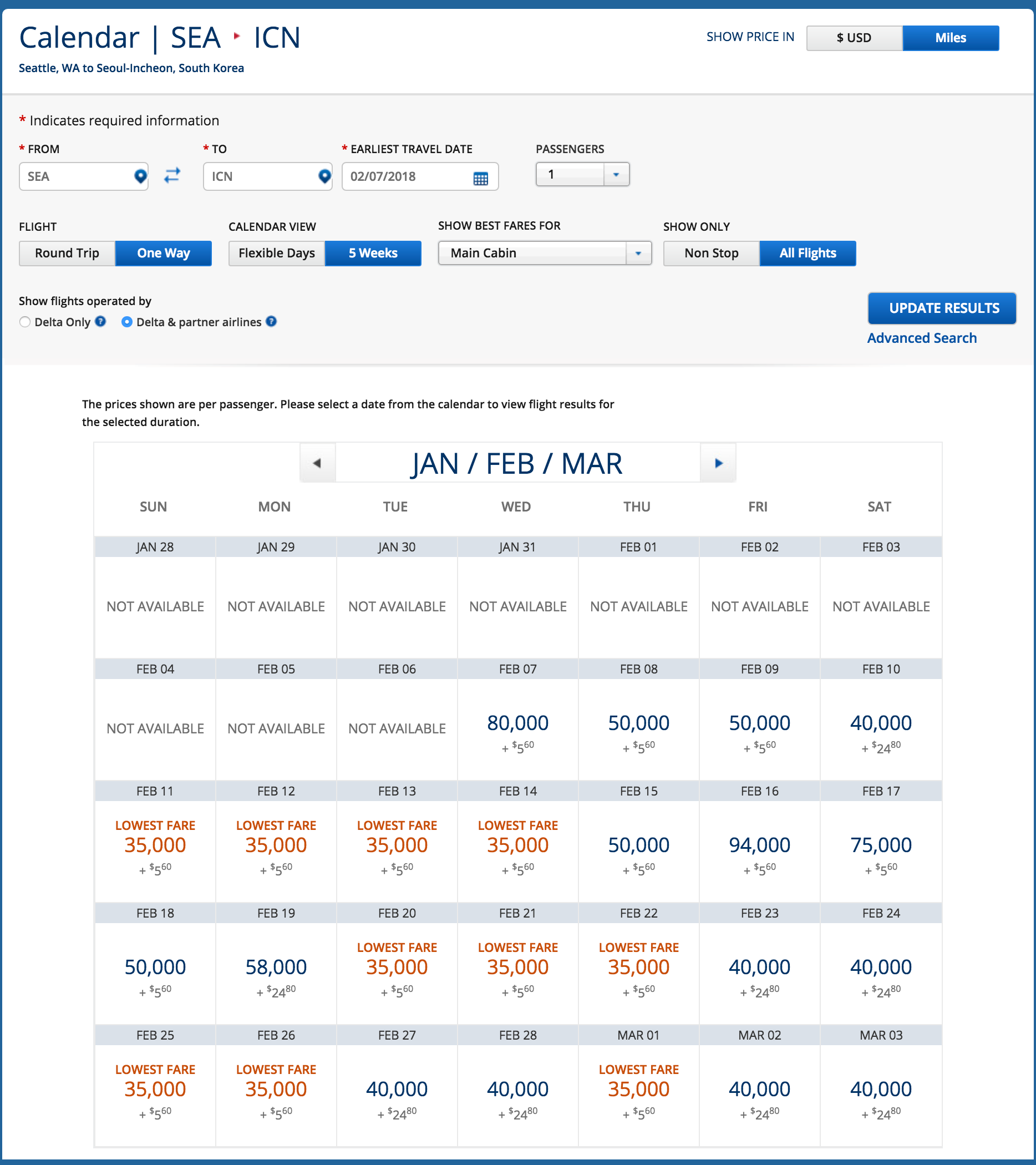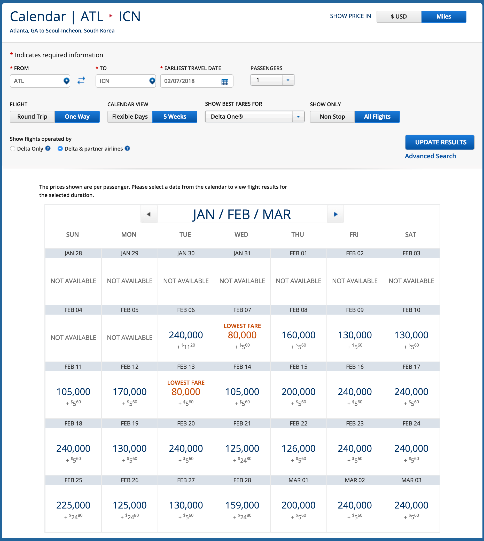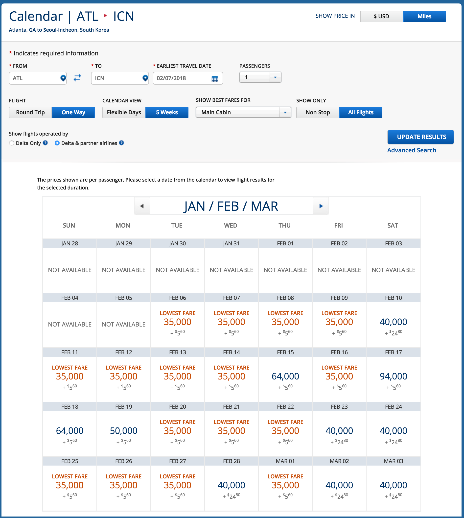 Somewhat surprising is Delta's open availability on several of its route — allowing you to get to Seoul in time for the Opening Ceremony. For example, from Atlanta (ATL), we're seeing solid availability in economy at the 35,000-mile level for the one-way trip to Seoul. You can fly on Delta's nonstop route to ICN for 35,000 miles one-way plus minimal taxes and fees.