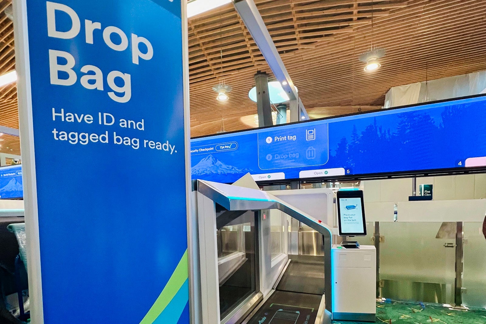 Airline check-in counters are clustered in four carpeted islands perpendicular to the entrance. Passengers flying Alaska Airlines with bags to check will find the newest iteration of the carrier's automatic bag drop system here. The self-service system encourages passengers to scan their boarding passes, print out and attach bag tags, weigh their bags, pay a checked bag fee (if necessary) and send the bags on their way.