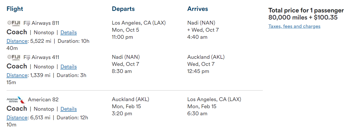I found the first route on Alaska Airlines, flying economy from Los Angeles (LAX) to Auckland (AKL) on Fiji Airways and returning on American Airlines. Each leg costs 40,000 miles, for a round-trip of 80,000 Alaska miles.