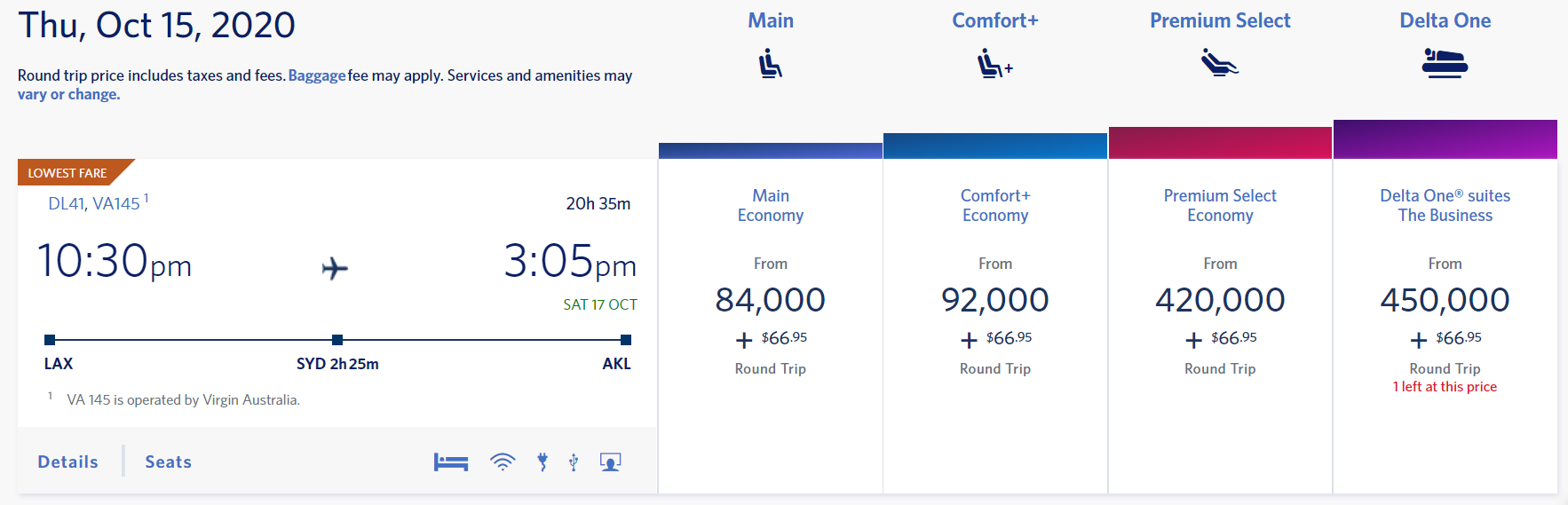 Delta SkyMiles has some comparable reward rates. The lowest redemption rate for a flight from Los Angeles (LAX) to Auckland (AKL) this fall is 84,000 miles round-trip for Main Economy. Premium cabin rates are higher, with Delta One costing a whopping 450,000 miles round-trip.
