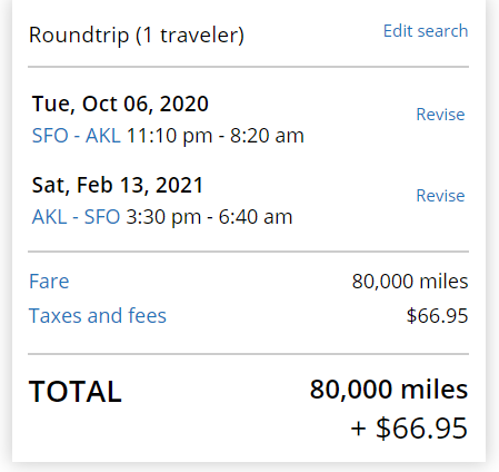 Direct routes from the U.S. to New Zealand have always been limited, even before the pandemic. Flights are expensive and can have long layovers. Award travel is hard to find — but not impossible. Given the current climate, these redemptions are standard across the next nine months.