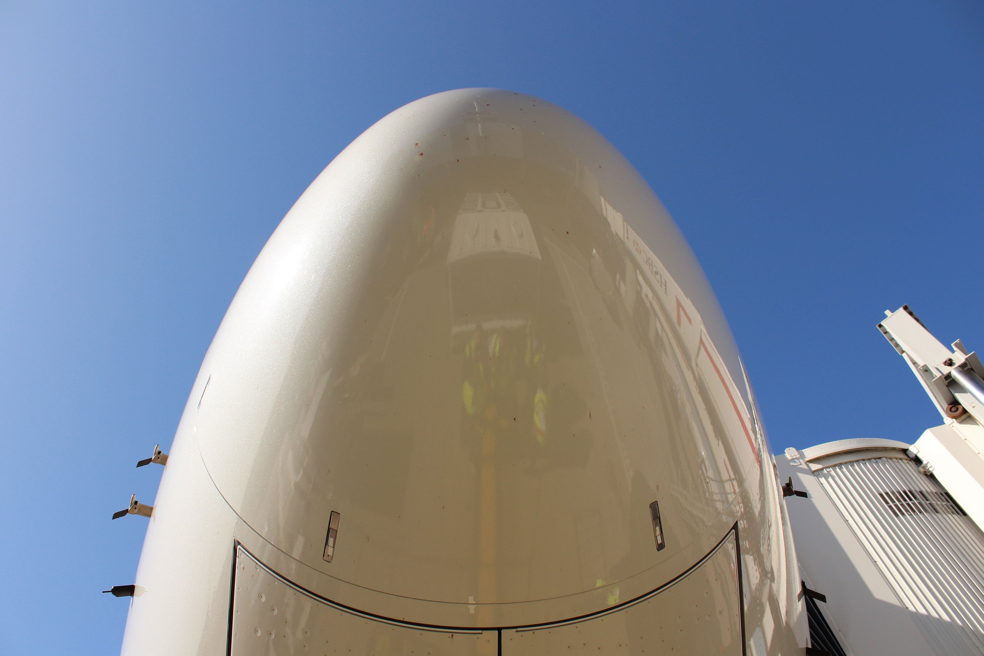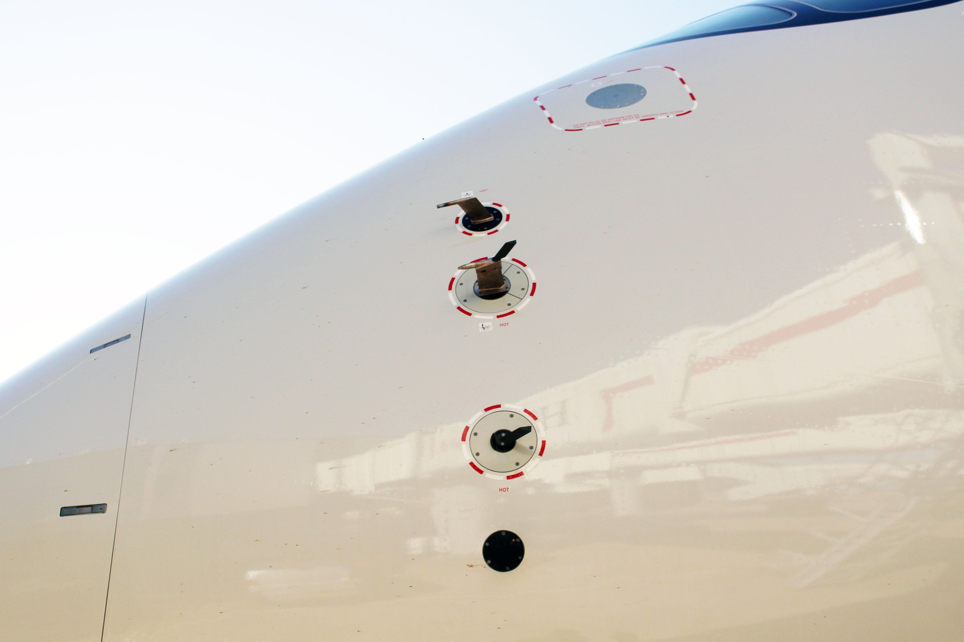 Following the visual inspection of the engines, we turned to face the leading edge of the wing, where this new airplane had received a small ding in test flights, from a bird strike. No matter, the leading edge had been patched up nicely. There were no signs of ice (although icing can occur as late as June and as early as late August in the U.S., there was none to be seen.)