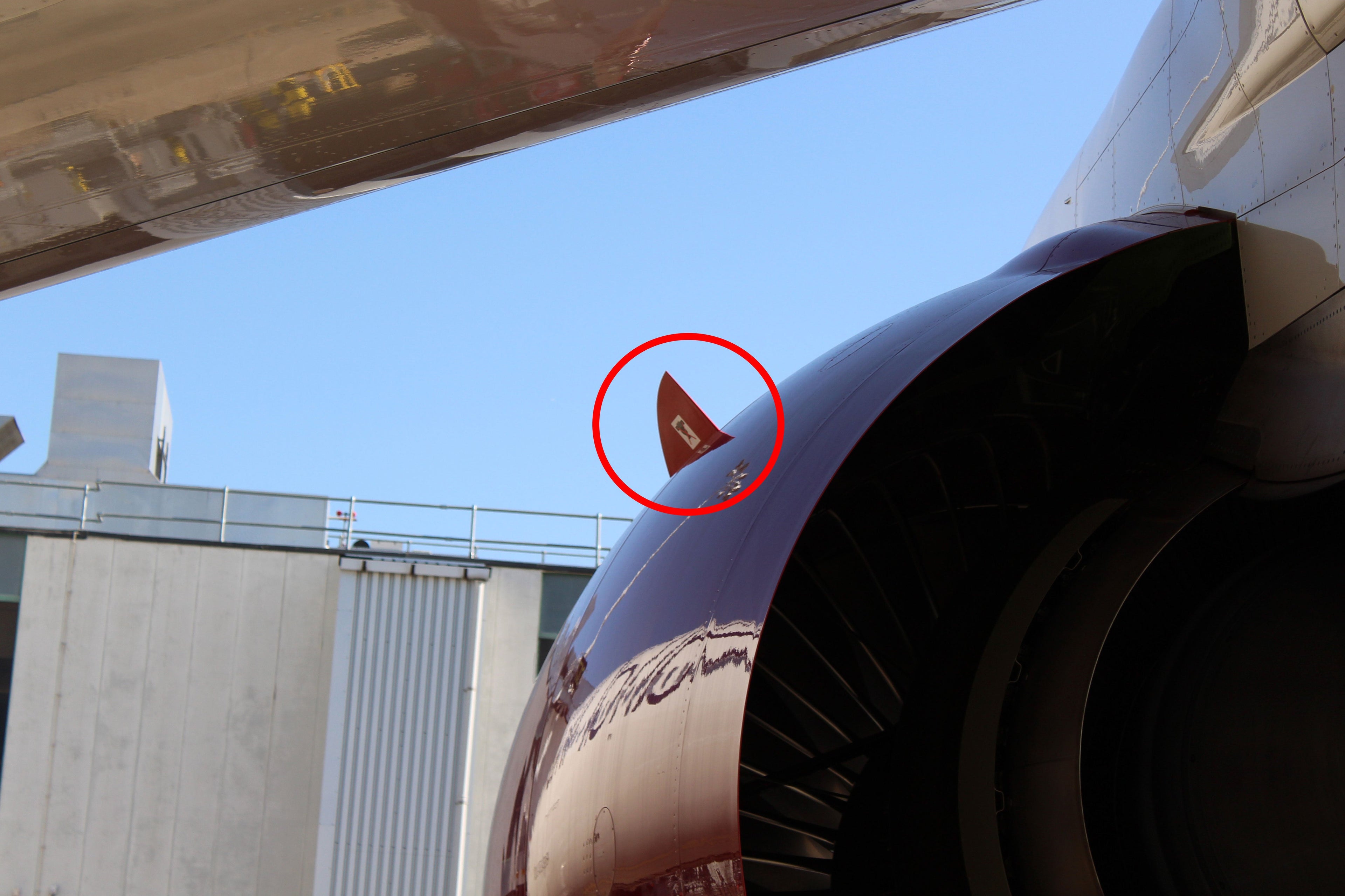 After looking at the leading and trailing edges of the wings, we moved to visually inspect the fan of the engine. Wyman pointed out the close tolerances of the fan blades in this Rolls Royce engine; there are only millimeters of space between the fan blades and the inside of the engine cover. There, he said he looks for anything that can be spotted with the naked eye that might call for further inspection from Virgin Atlantic engineering, such as nicks or dings. On the outside of the engine nacelle, Wayman pointed to a closed hatch. He explained that he wants to see that it's both present, closed and there's no fluid.