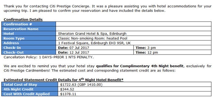 Once we made our way to Edinburgh, we wanted to take advantage of my Starwood Preferred Guest Platinum status so we opted to stay at the Sheraton Grand Hotel and Spa Edinburgh. Unfortunately, we had no choice but to book two rooms there as there are no rooms that accommodate four people. For the first room, we used our Citi Prestige card’s 4th Night Free benefit. At the time, there was no option to book online so I used the more cumbersome process of calling Citi, asking them to make the reservation and waiting a day to get it confirmed by email (although note that while you can now book online to use this benefit, you're unlikely to accrue points or progress toward elite status, so if that's important to you, you'll still want to book by phone or email). In the end, we saved about $345 by using the Citi Prestige.