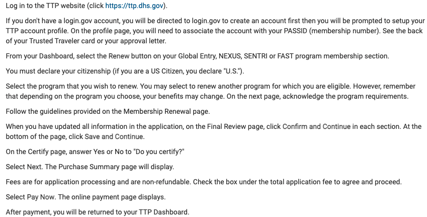 "If you submit a renewal application before your membership expires, you will be able to continue to use benefits up to 24 months after your membership expiration date," says the U.S. Department of Homeland Security, which provides the below instructions on how to renew your membership for Global Entry, Nexus or Sentri.
