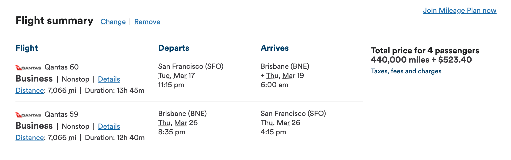 However, the best option for booking is likely through Alaska Mileage Plan. This non-alliance partner of Qantas will only require 55,000 miles each way plus roughly $130 in taxes and fees — one of the best sweet spots in the world of award travel. And it appears that all of these flights are currently bookable through Alaska, like this award for four travelers in mid- to late-March: