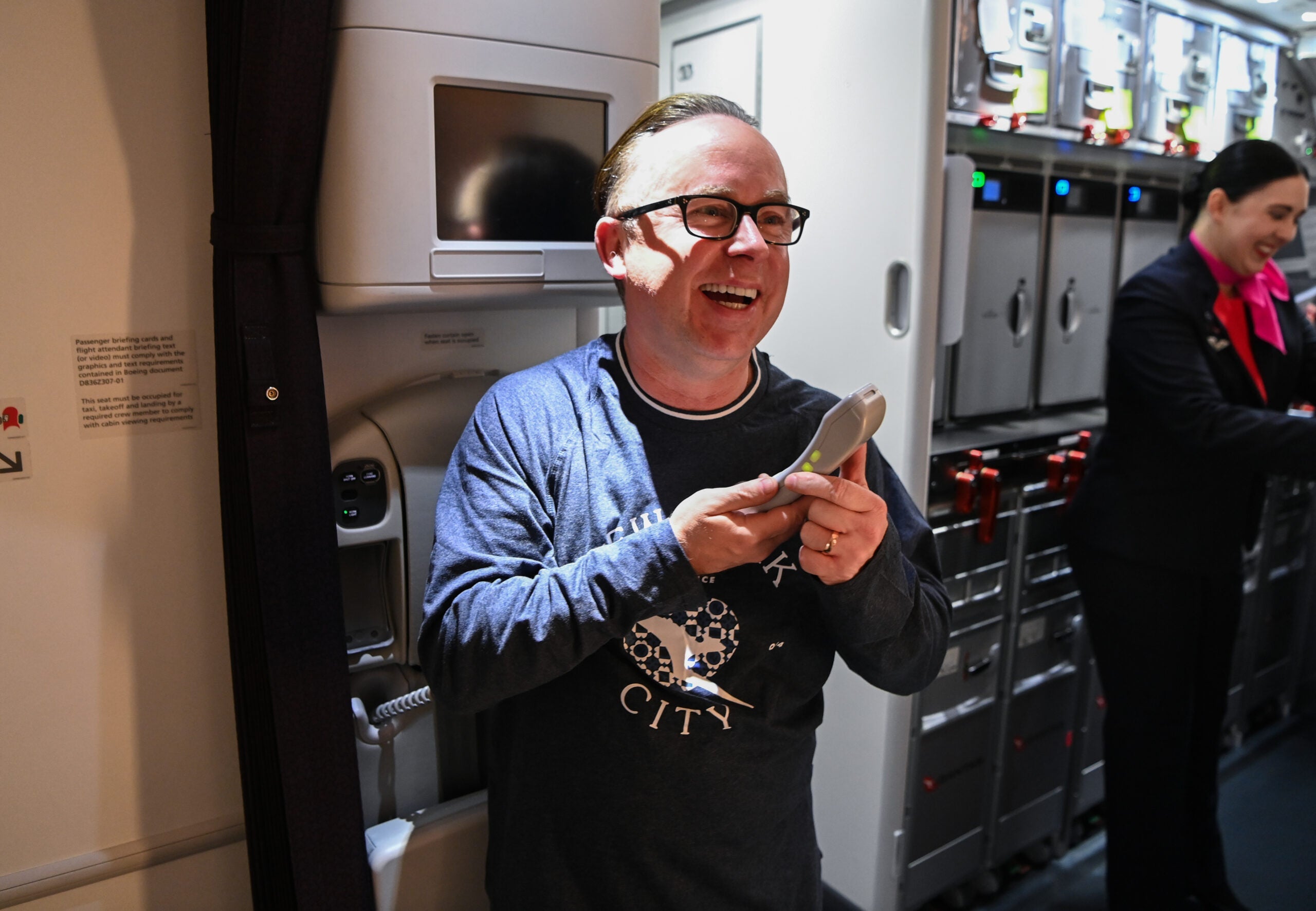 Once on the plane, passengers were greeted over the PA system by Joyce — he was a passenger on the inaugural. He called out the significance of the flight and the interest Qantas' inaugural appeared to be generating.