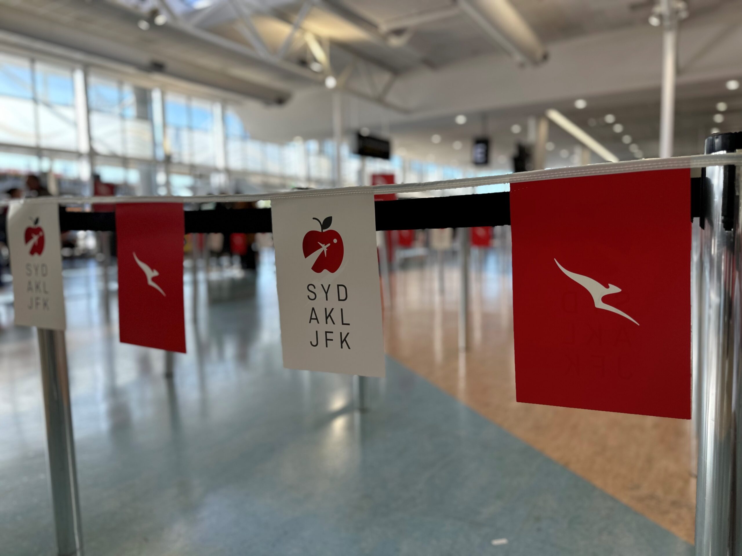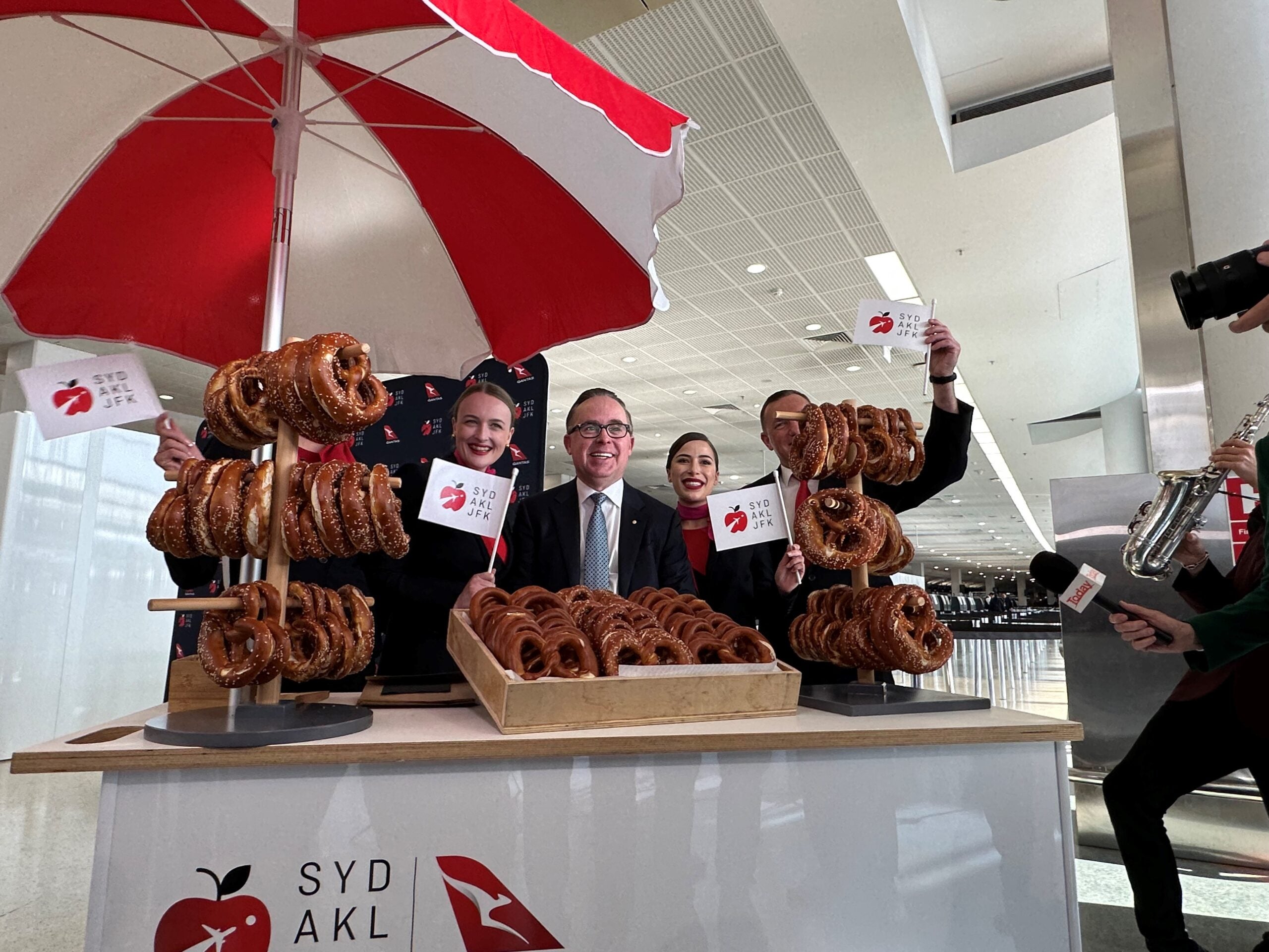 Special placards marking the occasion were strung across Qantas' entire check-in queue. Even the digital counter screens flashed inaugural branding. Harder to miss was the live saxophone player performing "New York, New York" in front of a pop-up soft-pretzel stand that offered passengers a free New York City-themed snack.