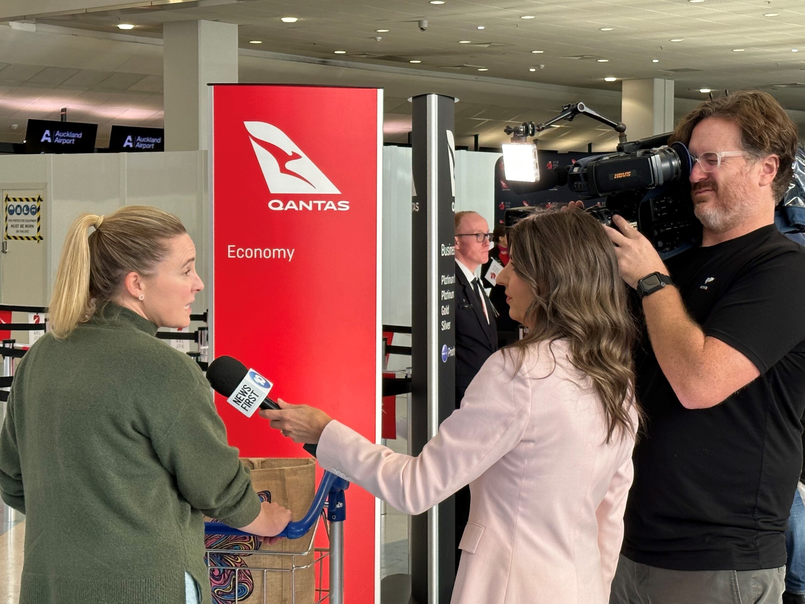 Qantas CEO Alan Joyce added to the fanfare with a press conference in front of the check-in counters. Joyce answered questions as TV cameras from Australia and New Zealand news and morning shows caught the action.