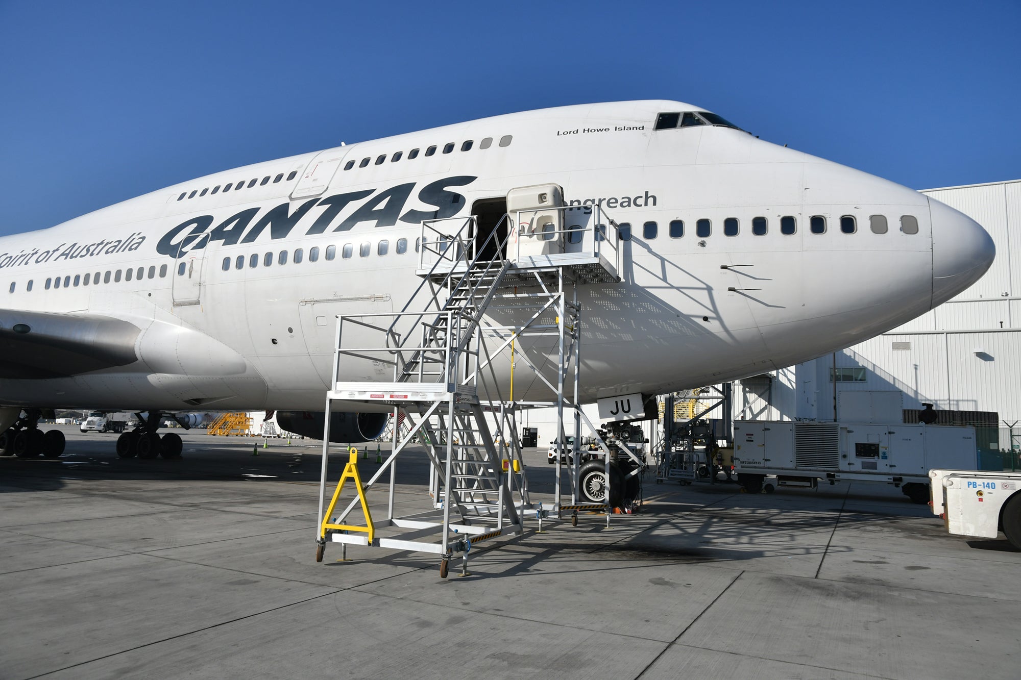 When a Qantas Airways Boeing 747 did just that this week, flying from its home in Australia to the northwestern U.S. to become a test platform for Rolls-Royce jet engines, we went along for the ride — a unique flight on Tuesday from Los Angeles International Airport to Moses Lake in eastern Washington state. That's a small city with a huge airport, where there's no commercial air traffic and plenty of space for aviation engineering company Aerotec to build a hangar for the giant airplane and transform it into a flying lab.