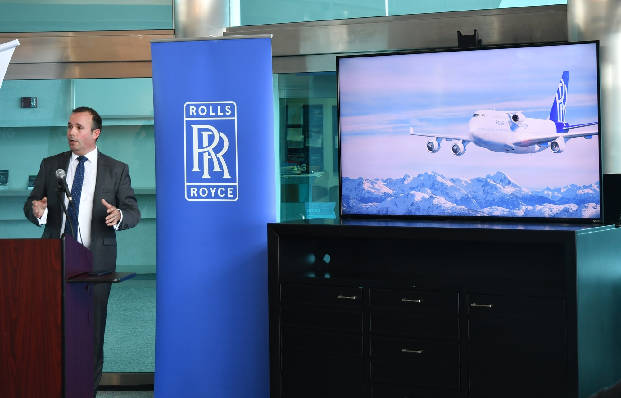 Some of the cargo bays will be modified to install data-measuring equipment, said Rolls-Royce's Director of Development and Engineering, Gareth Hedicker, speaking at the Moses Lake airport as the plane sat nearby. Some of the current passenger seats will remain, but most of the cabin will be used to house test equipment.