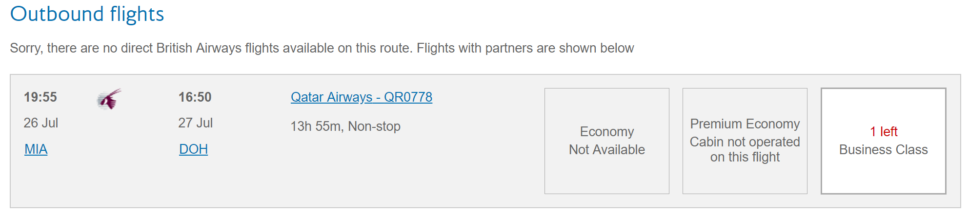 - QR778 Miami (MIA) 19:55 departure => 16:50 Doha (DOH) arrival on July 27