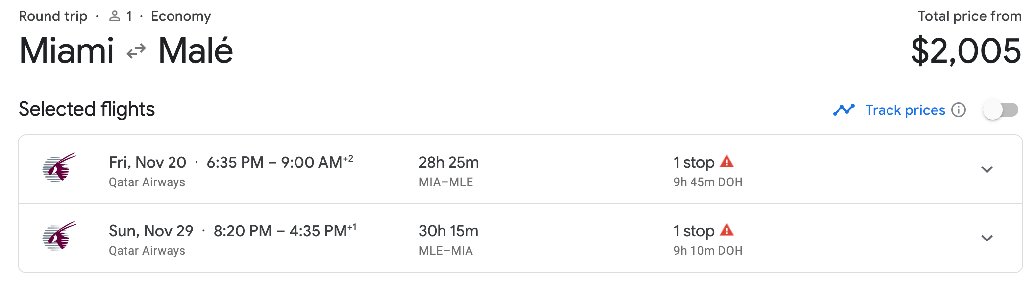 For example, let's say you wanted to spend Thanksgiving in the Maldives. Flights out of Miami (MIA) to Malé (MLE) are quite expensive — over $2,000 per person round-trip in economy.