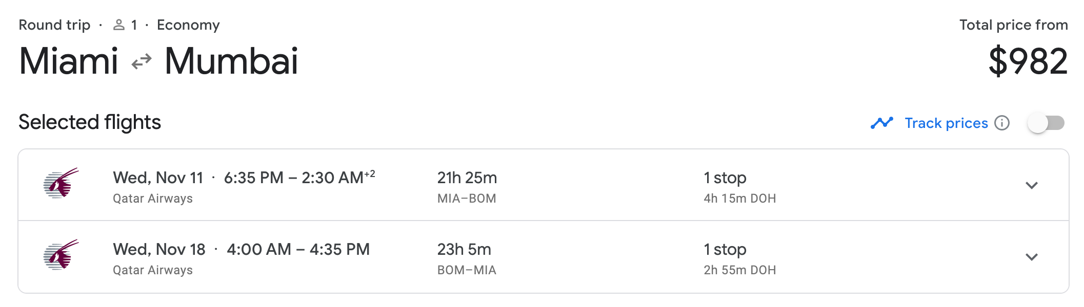 However, a round-trip flight from Miami to Mumbai (BOM) for nearby dates is less than half that amount.