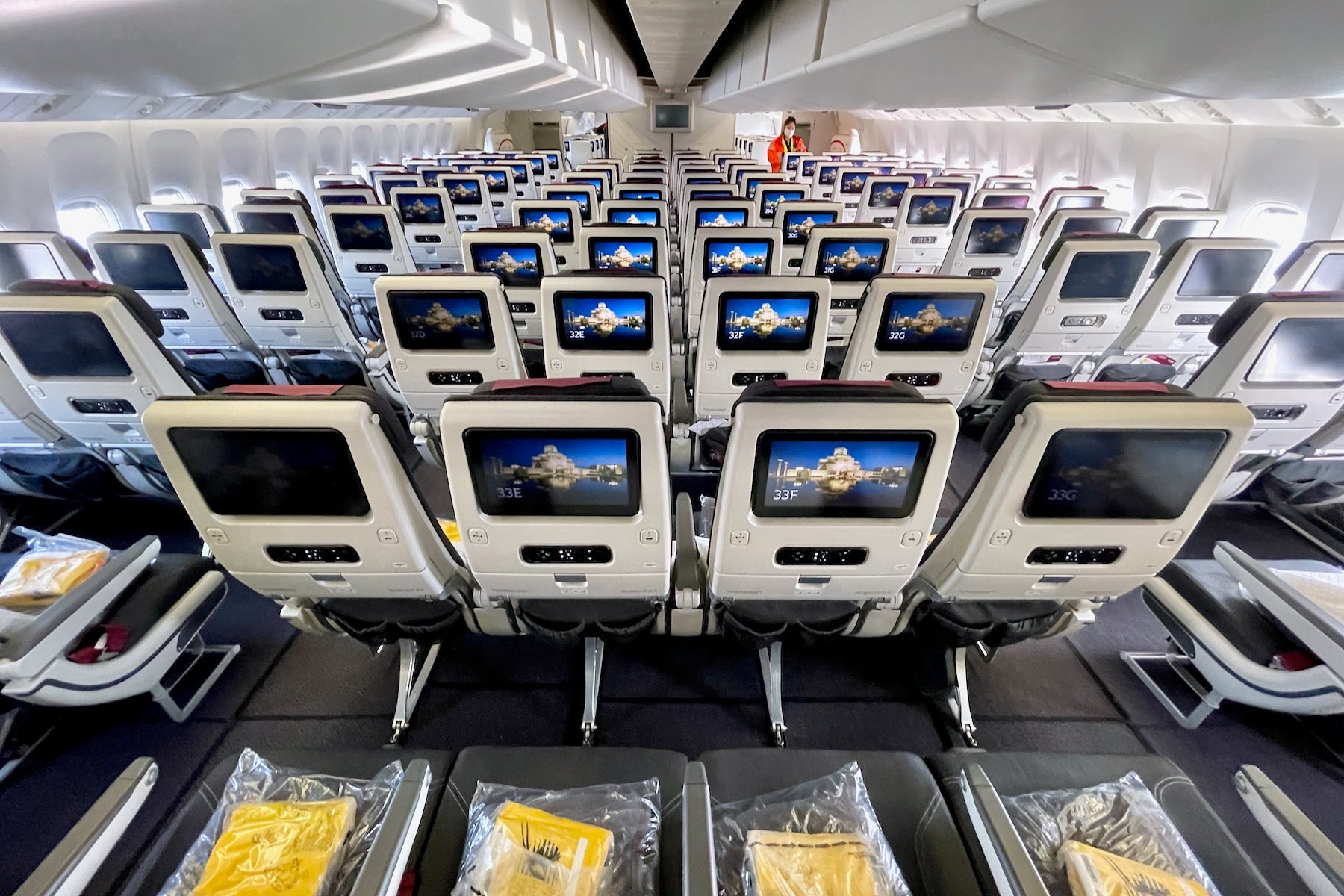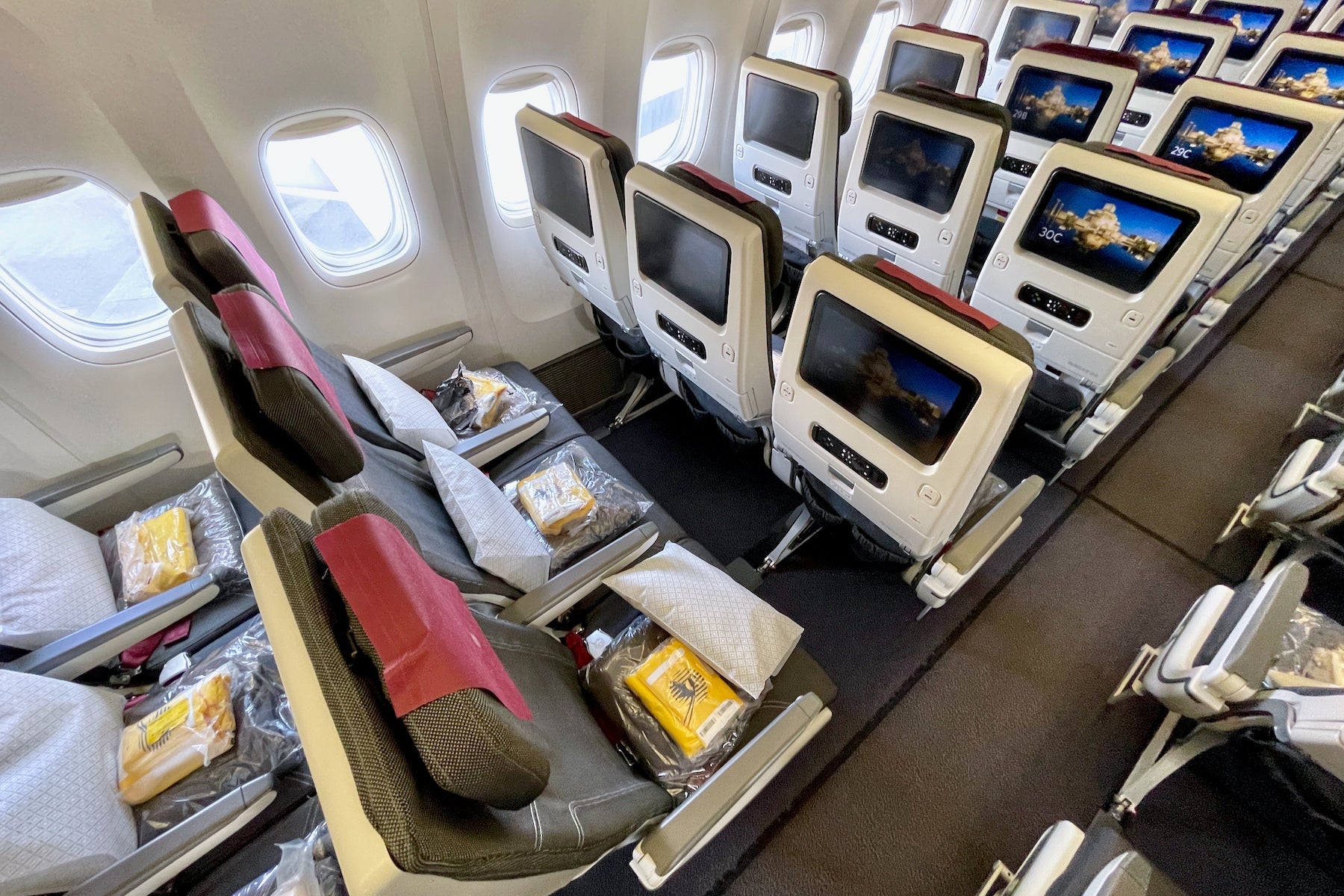 Most economy seats are more or less identical. Each seat is 17 inches wide and offers at least 31 inches of legroom. Features of the seats include crisp touchscreen entertainment systems, built-in USB ports and universal power outlets.