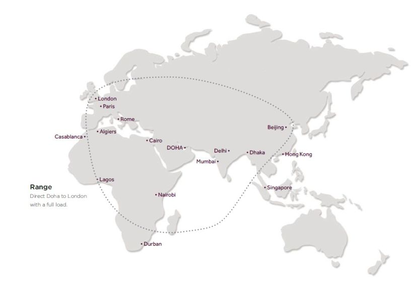 Instead of DOH-LHR, the A319 is now used for charter service, flying executives, large (wealthy) families and other customers to and from nearly any airport in the world, on demand. The plane has a range of just under 4,000 miles, so while it could fly across the Atlantic, operating, say, London to New York, it's a better fit for flights out of Qatar's Doha hub, instead. You can see where the aircraft can take you without a stop via the map below: