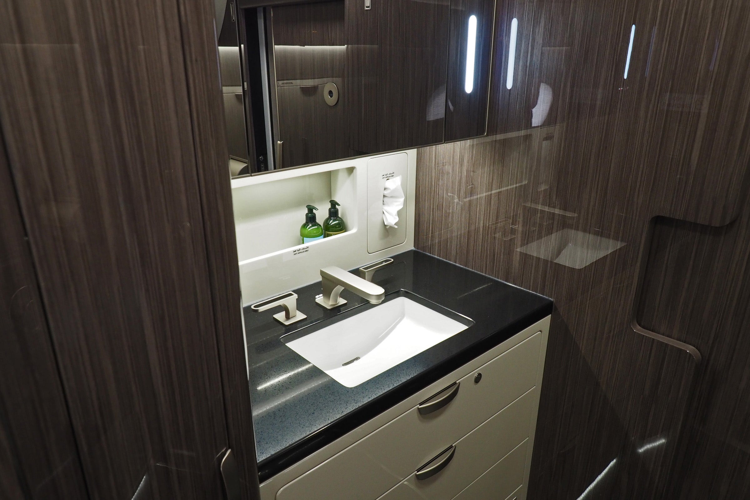 At the far back of the cabin is a large lavatory, complete with a sink you're more likely to find in a home than on a plane.
