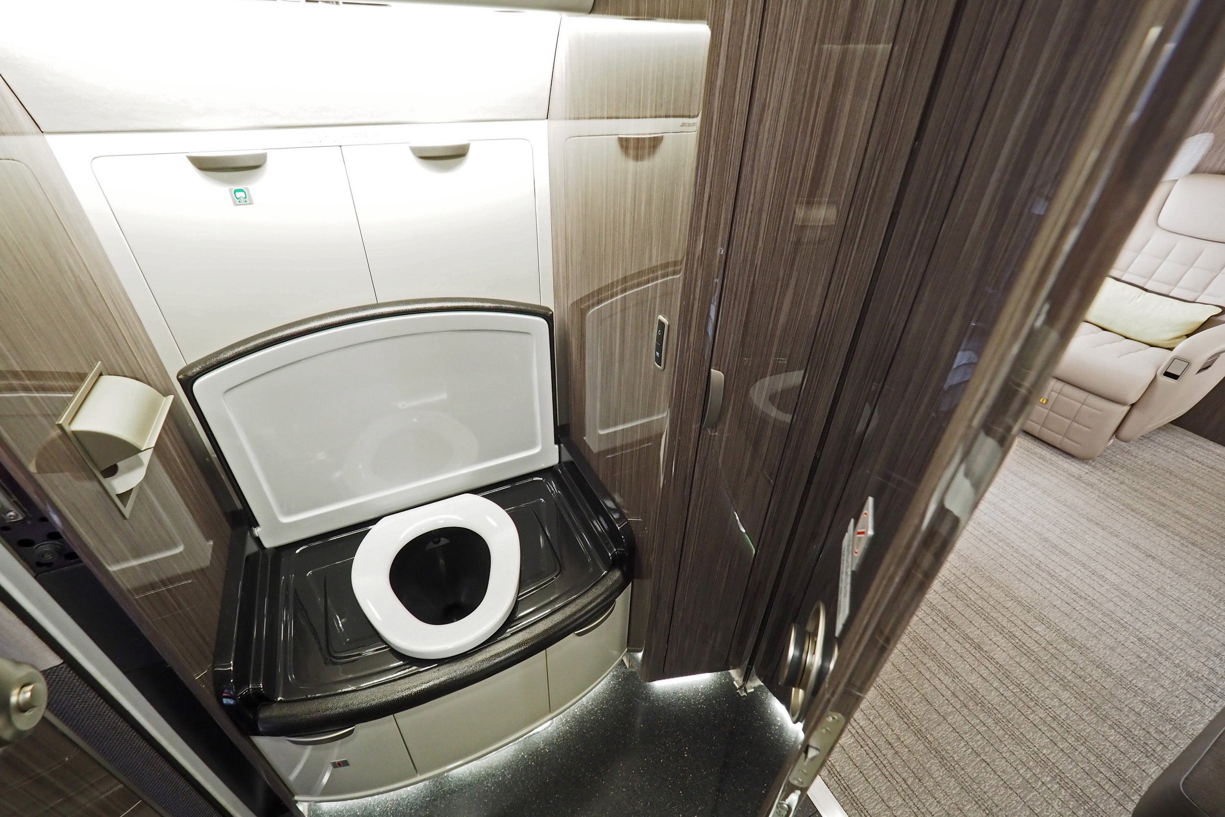 The toilet is hidden as well — you'll need to flip up the large leather seat to reveal it.