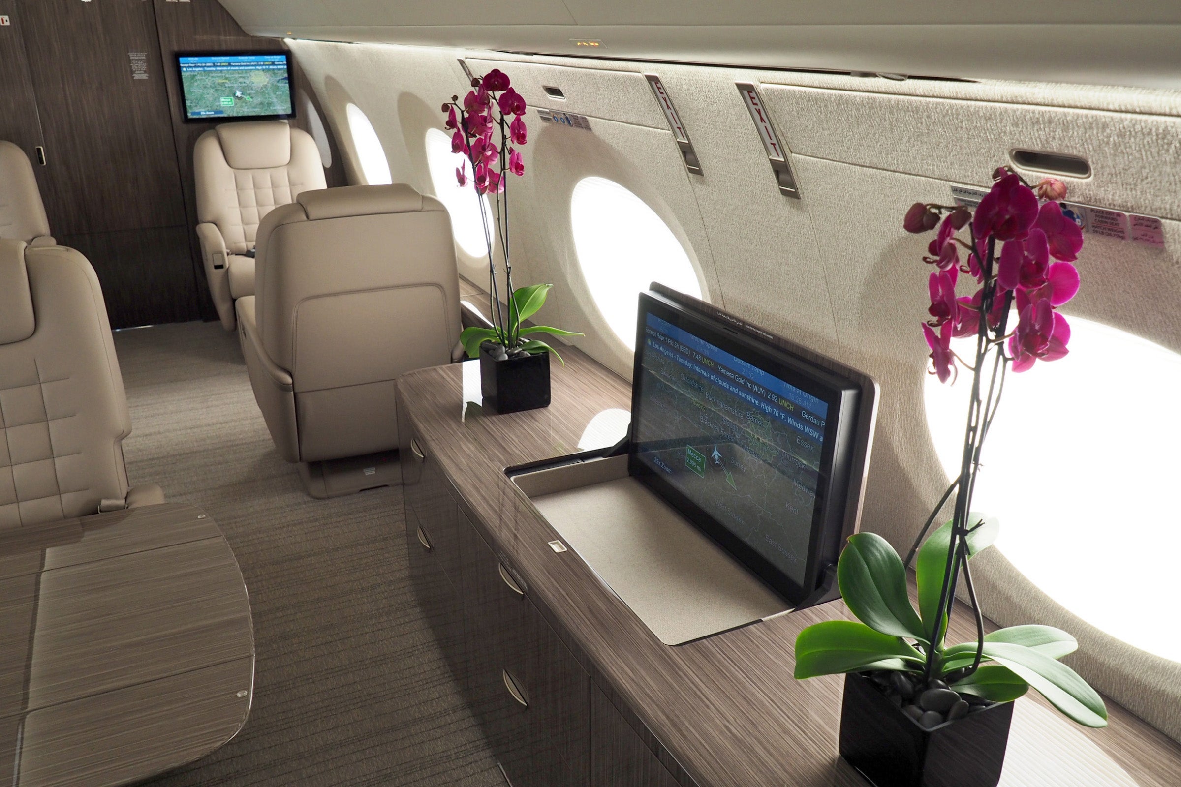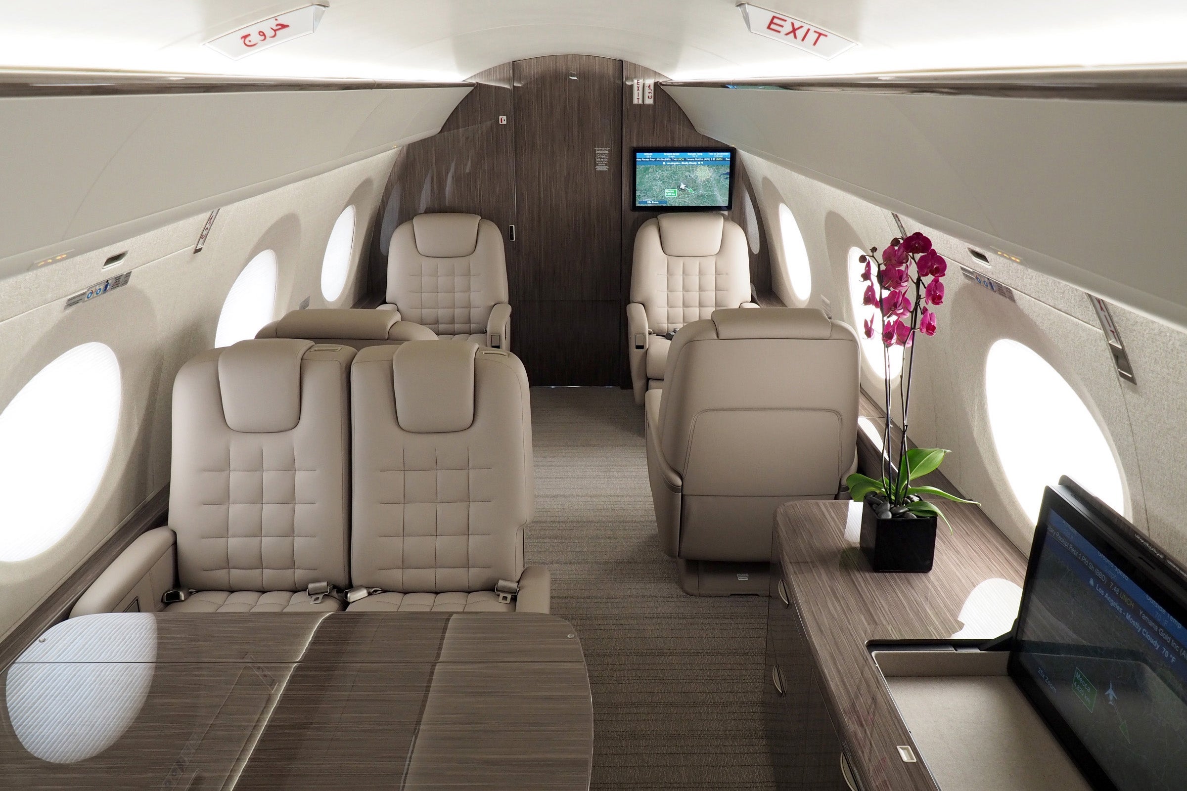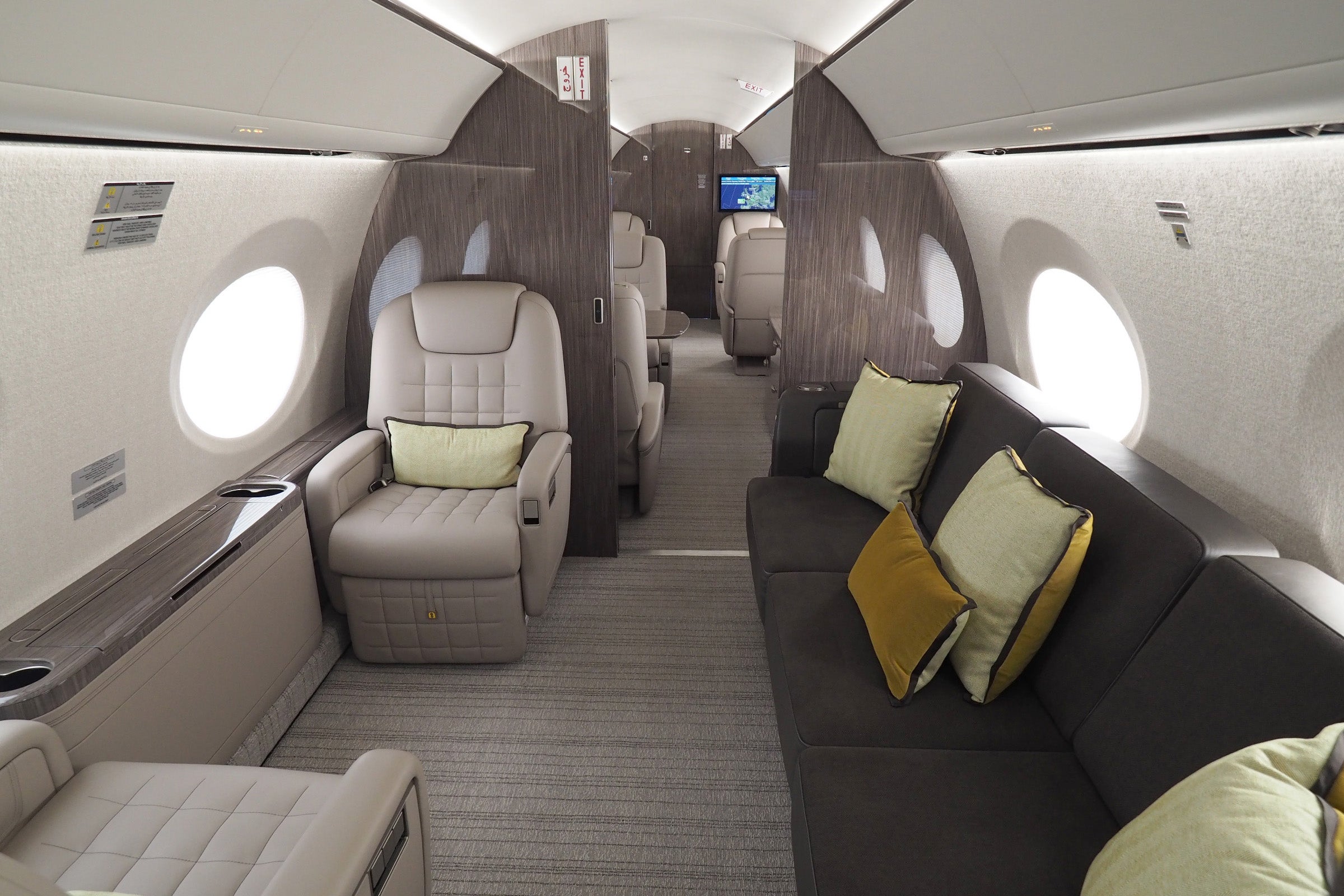 There are two separate passenger compartments, just like on the G650ER. The rear compartment has a separate fold-out sofa, and all of the seats can fold flat to create a bed.