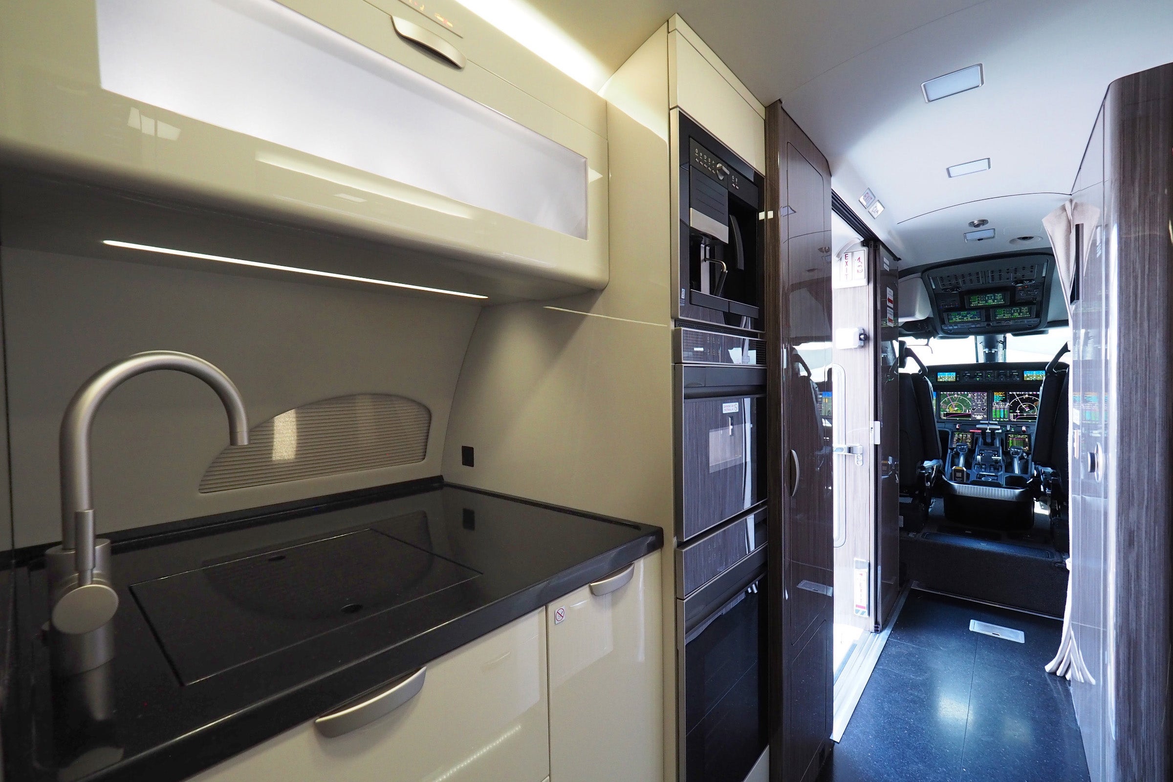 There's a full galley up front, complete with another sink, an oven and espresso machine.