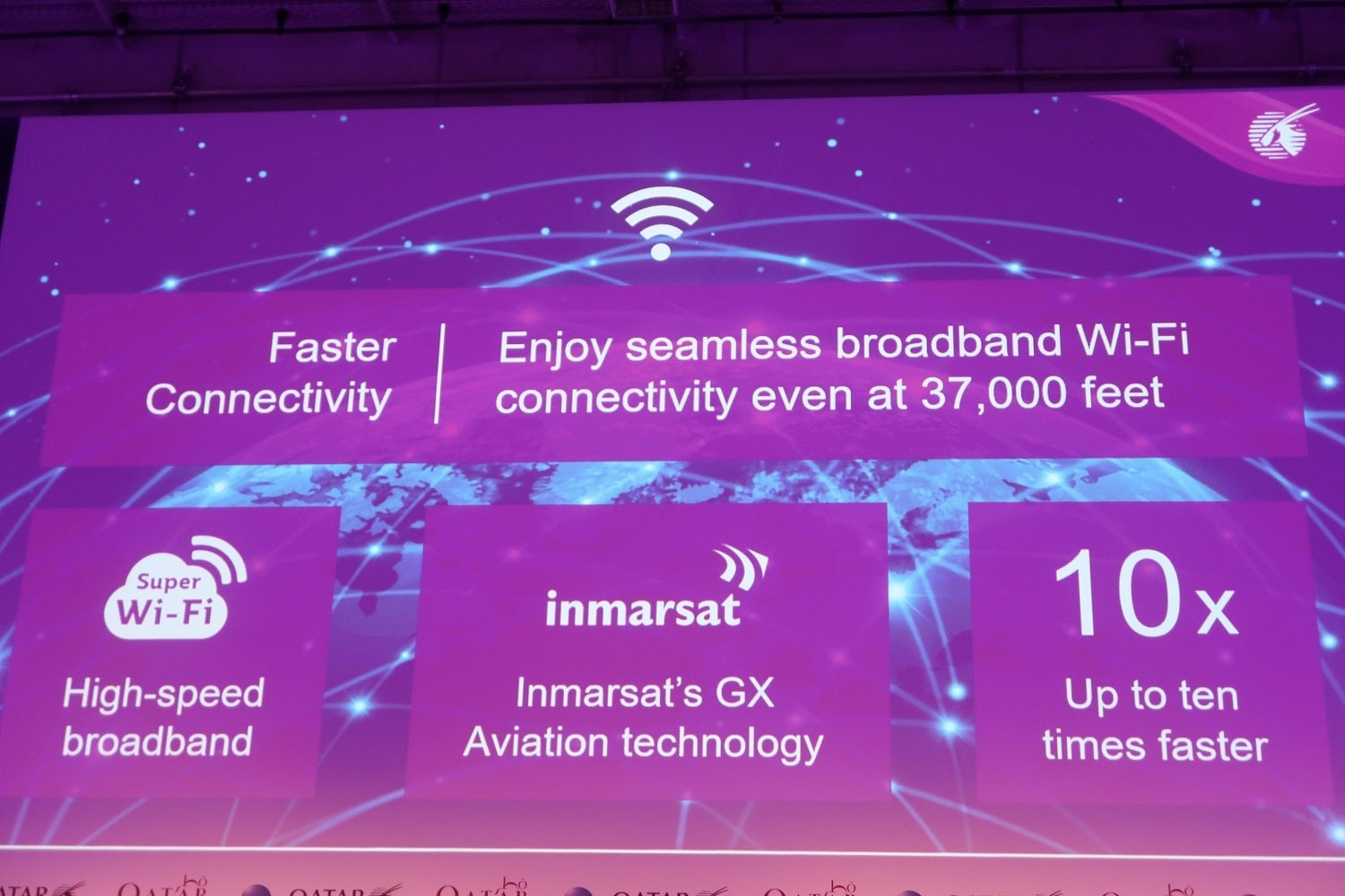 Qatar is also committing to provide "connectivity at all flight levels" through its Inmarsat-powered Wi-Fi system. Details are light, but Qatar claimed at the press conference that the Wi-Fi speeds would be "up to 10 times faster."