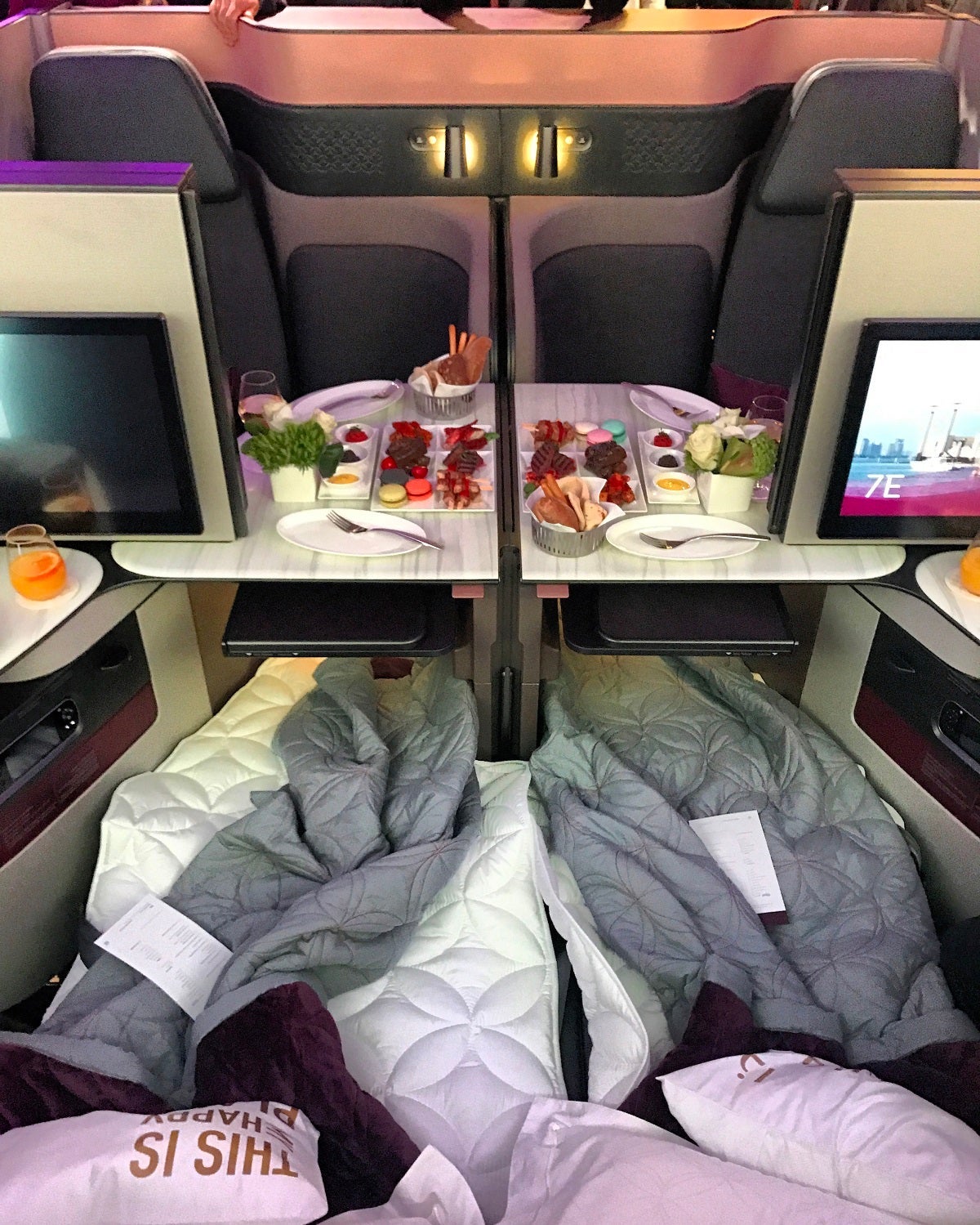 All Qsuite seats recline into a fully-flat 79-inch (6 foot 7 inches) bed. The table located next to the bed is large and provides a storage shelf under the surface.