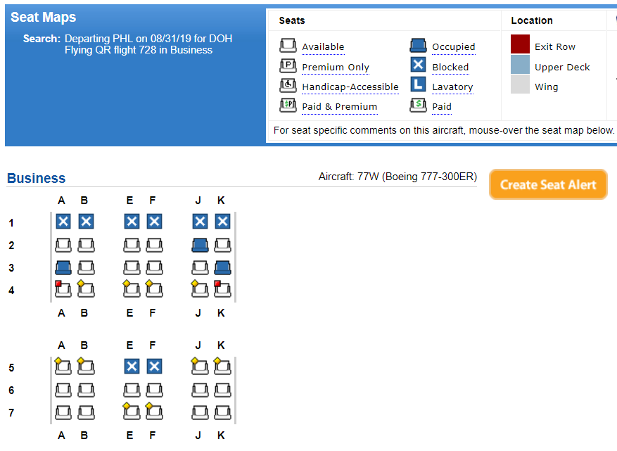 As of the latest seat maps and schedules filed by the airline, the Philadelphia route is switching to a non-Qsuite Boeing 777-300ER from June 1 - August 31. That's a pretty ugly change for the summer travel season as it swaps from a solid 1-2-1 Airbus A350-900 to an aircraft arranged with 2-2-2 business class seating.