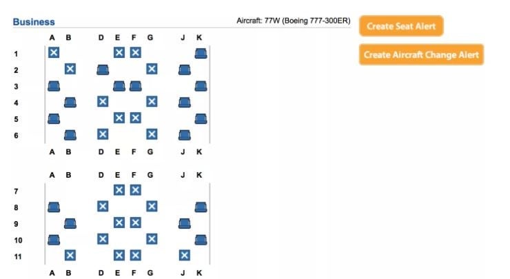 On the 777-300ER, the E and F seats in the odd-numbered rows are directly adjacent to each other. There's a divider that can be raised to provide privacy for each of these seats, but when it's lowered, and the seats are fully reclined, they essentially create a double bed — perfect for traveling with a companion.