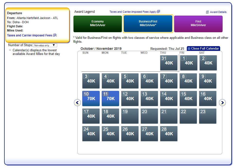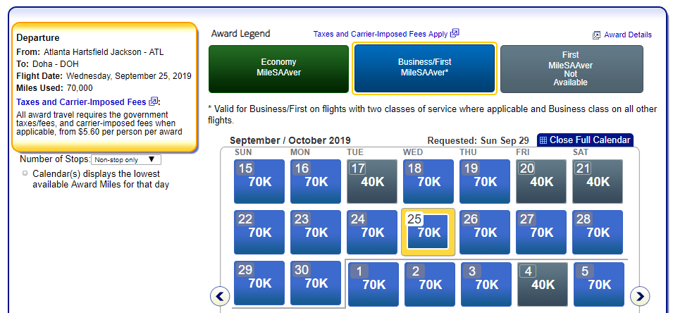 The only upside to the change is that this increases the number of available business class seats from 36 to 42. However, this doesn't seem to have opened up any more availability, at least yet. Before the change, there are quite a few dates with award availability on the nonstop from Atlanta to Doha: