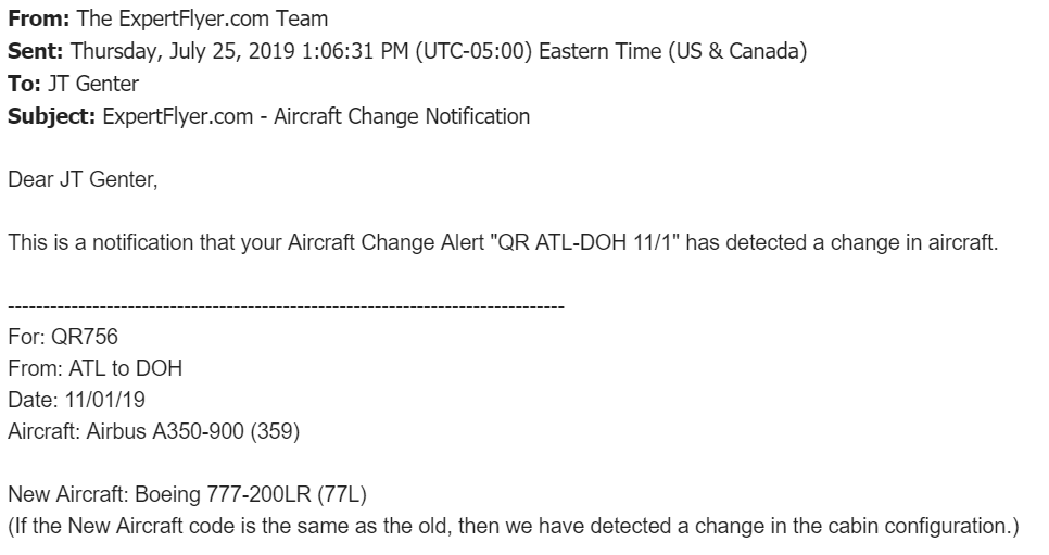 So, I was optimistic when a number of ExpertFlyer aircraft change notifications came through Thursday afternoon for the Atlanta-Doha route. Would this finally be the long-awaited addition of Qsuite to the Atlanta route?