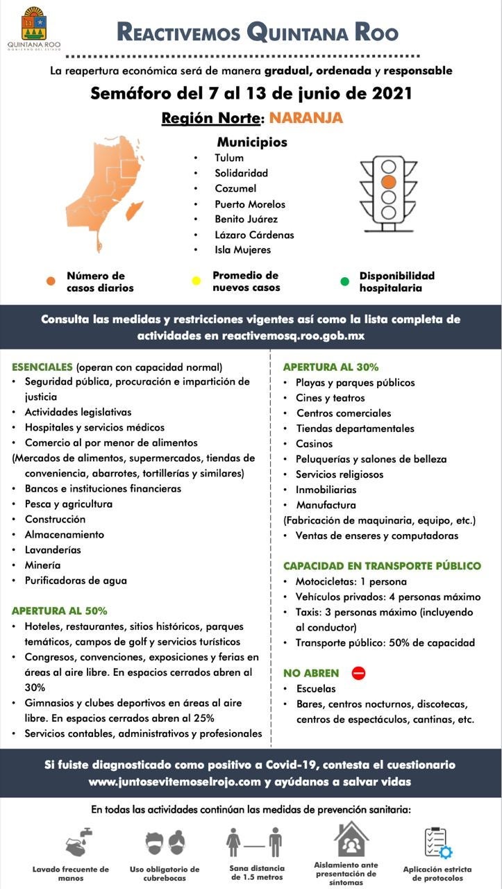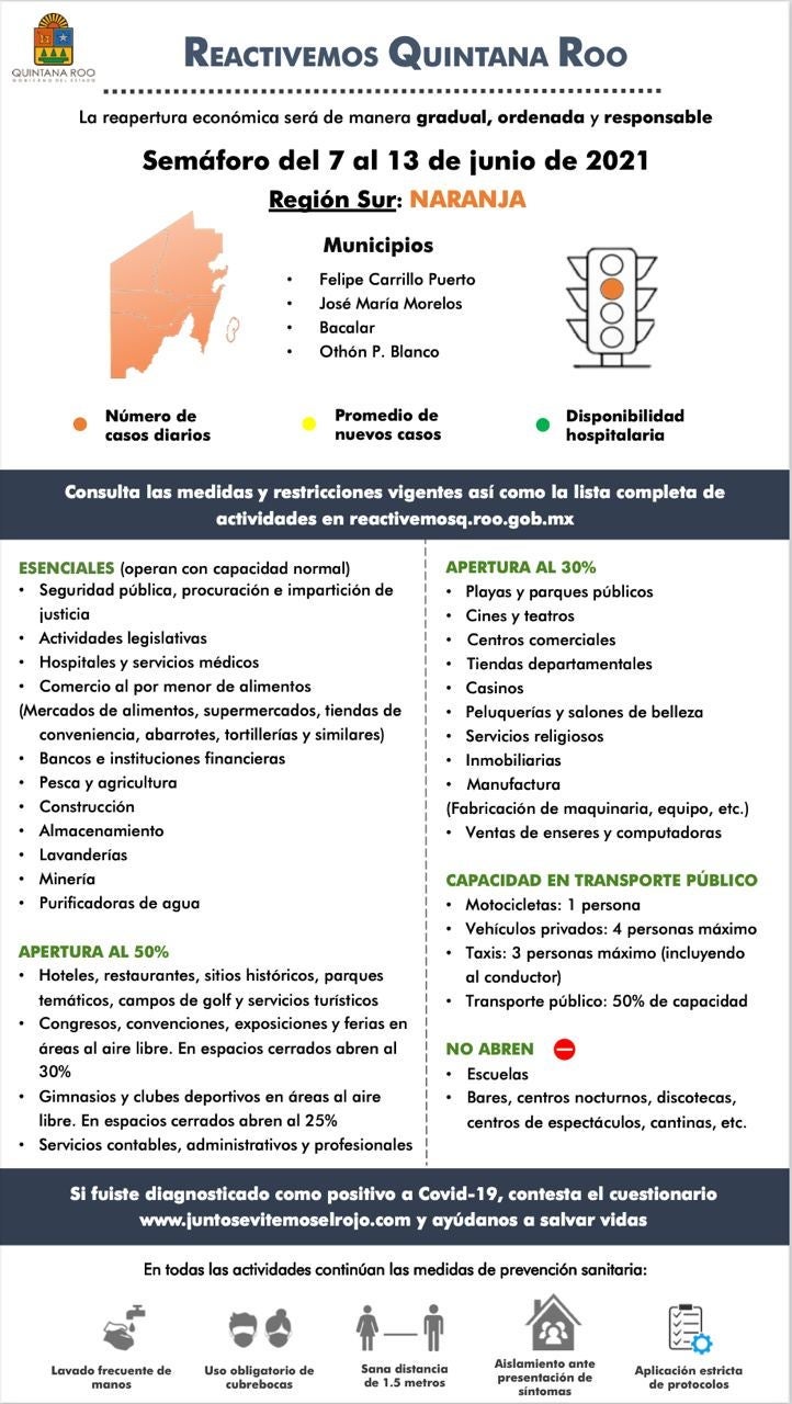 Quintana Roo will, for now, remain under the "orange" designation, which means that essential and nonessential labor activities are permitted but with certain limitations. Activities in public spaces are allowed but with restrictions, and tourist activities and hotels and restaurants are currently capped at 50% occupancy.