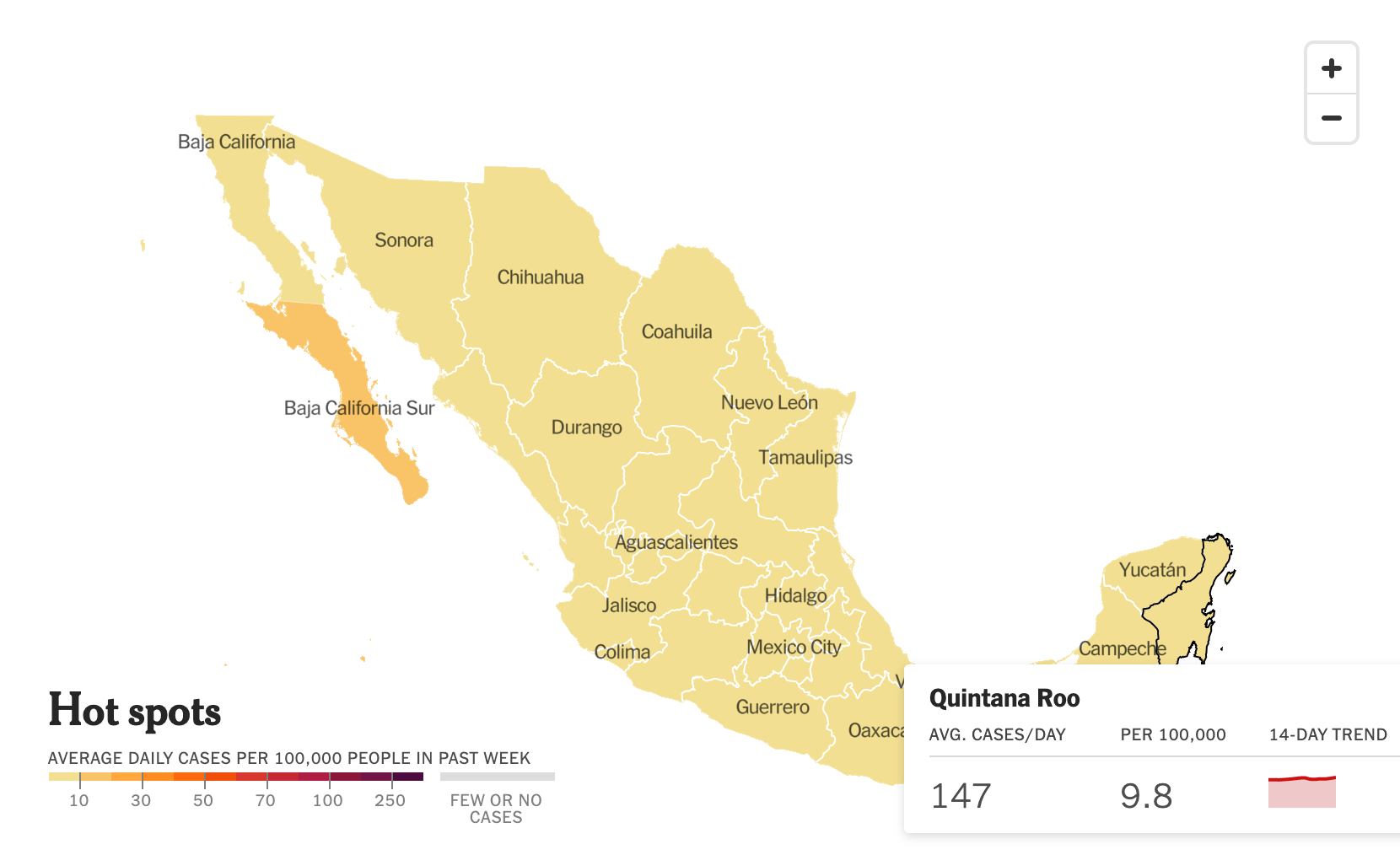 The New York Times puts Quintana Roo's daily average at 147 cases and notes an upward trend over the past two weeks. Only 11% of the country's population is fully vaccinated, and just 18% have received at least one of two doses.