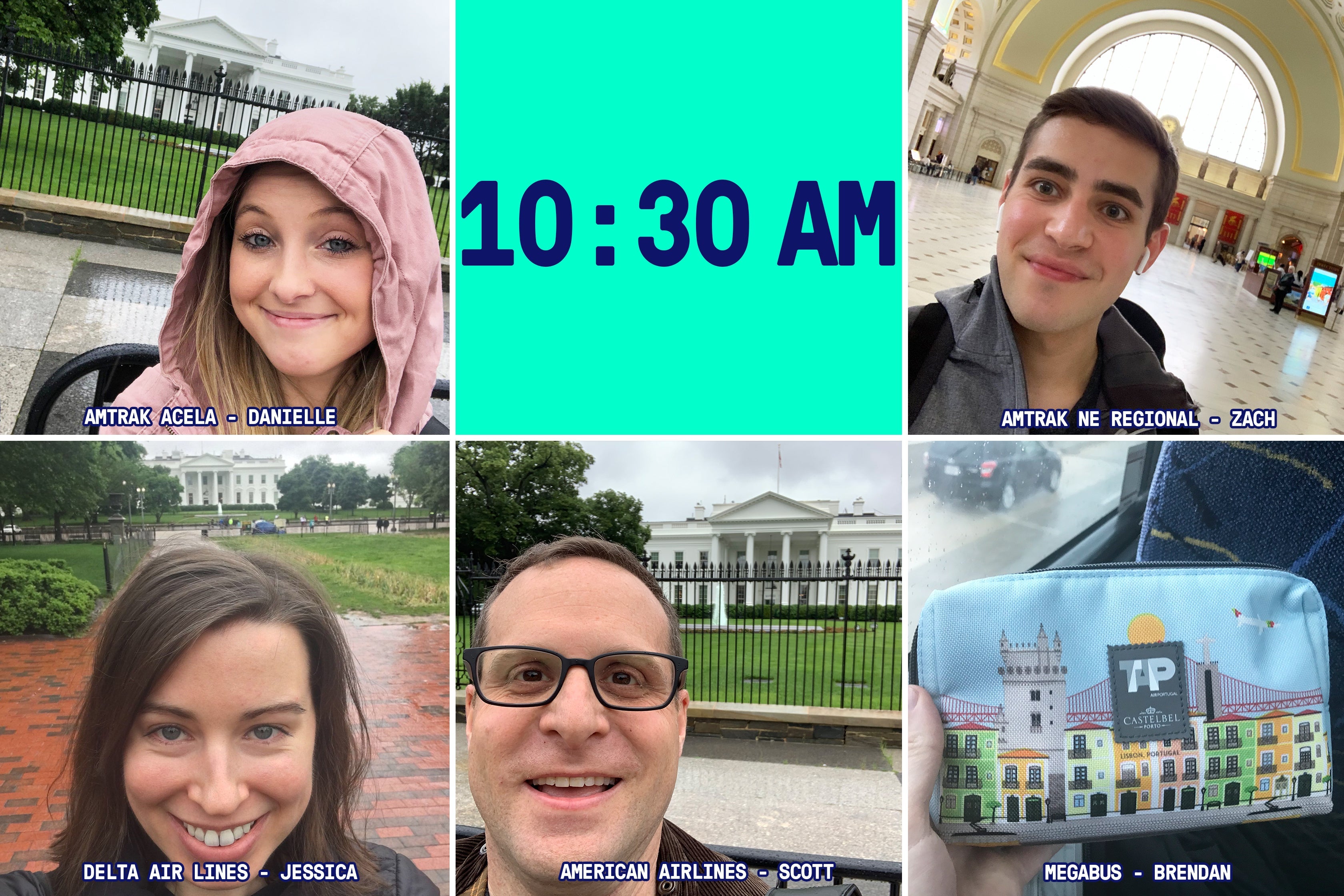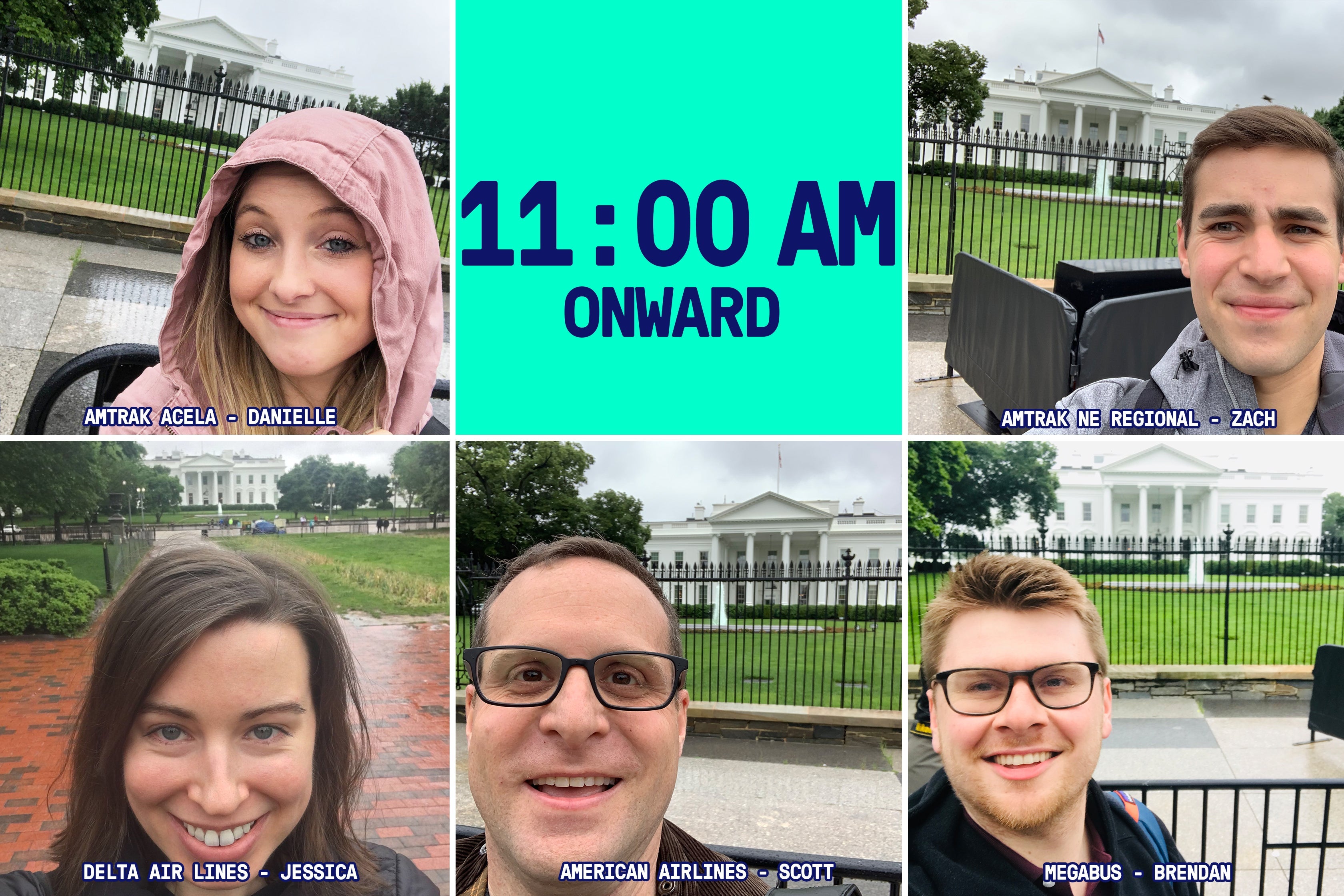 Amtrak NE Regional: Zach arrived at Union Station at 10:33am, hopped onto the Red Metro line, and walked the last few minutes to the White House, where he arrived in fourth place at 10:59am.