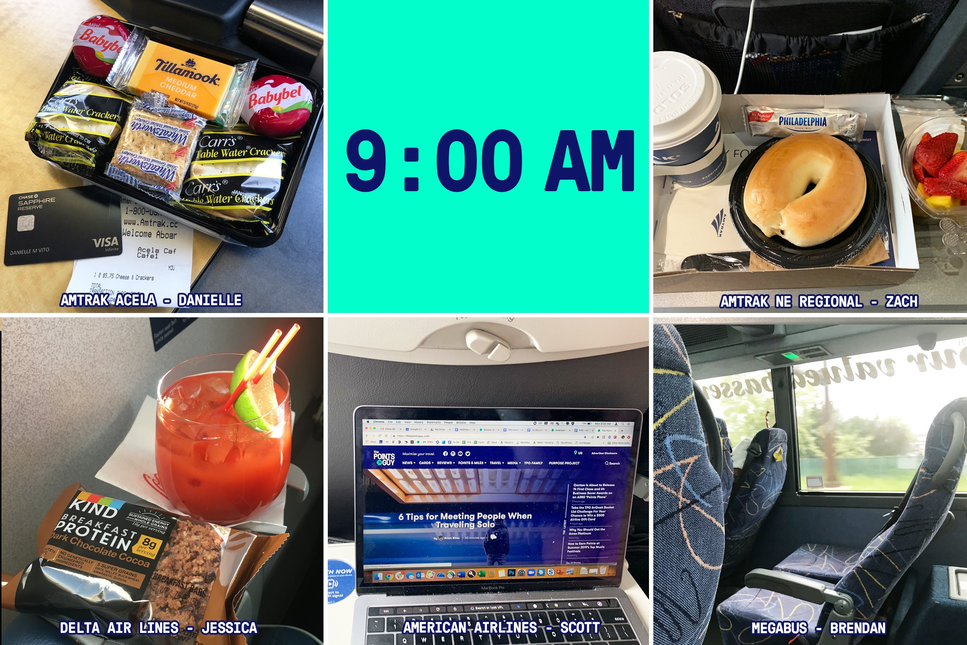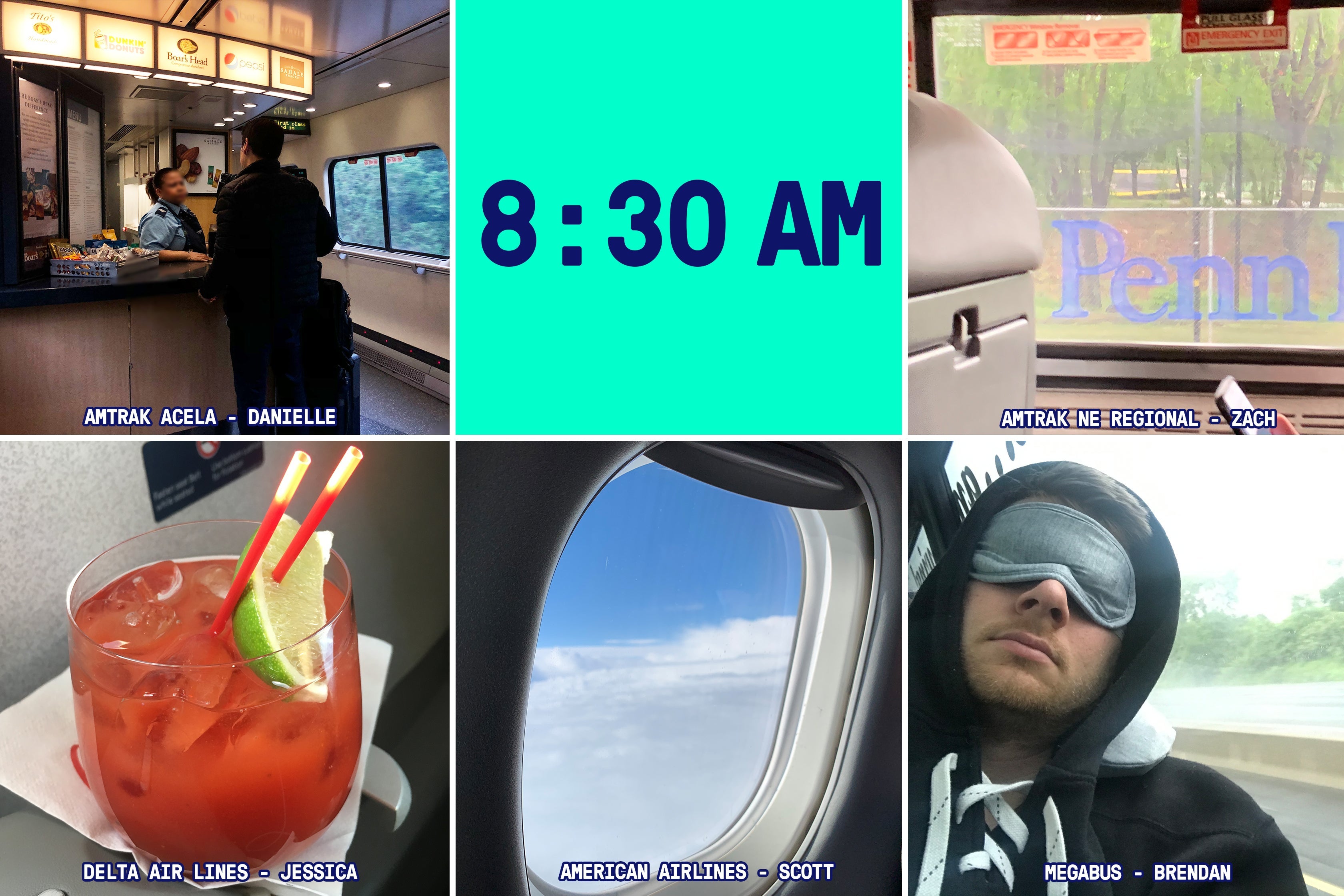 Plane: Flying in the morning was the fastest option, even without going standby for an earlier flight. Traffic was light in New York and the morning rain turned out to be a non-issue. There were no air traffic control delays or ground stops. But it was not the most productive way to travel. Between the taxi, the airport lounge, security, waiting for takeoff and landing, the plane travelers were working in a series of short bursts.