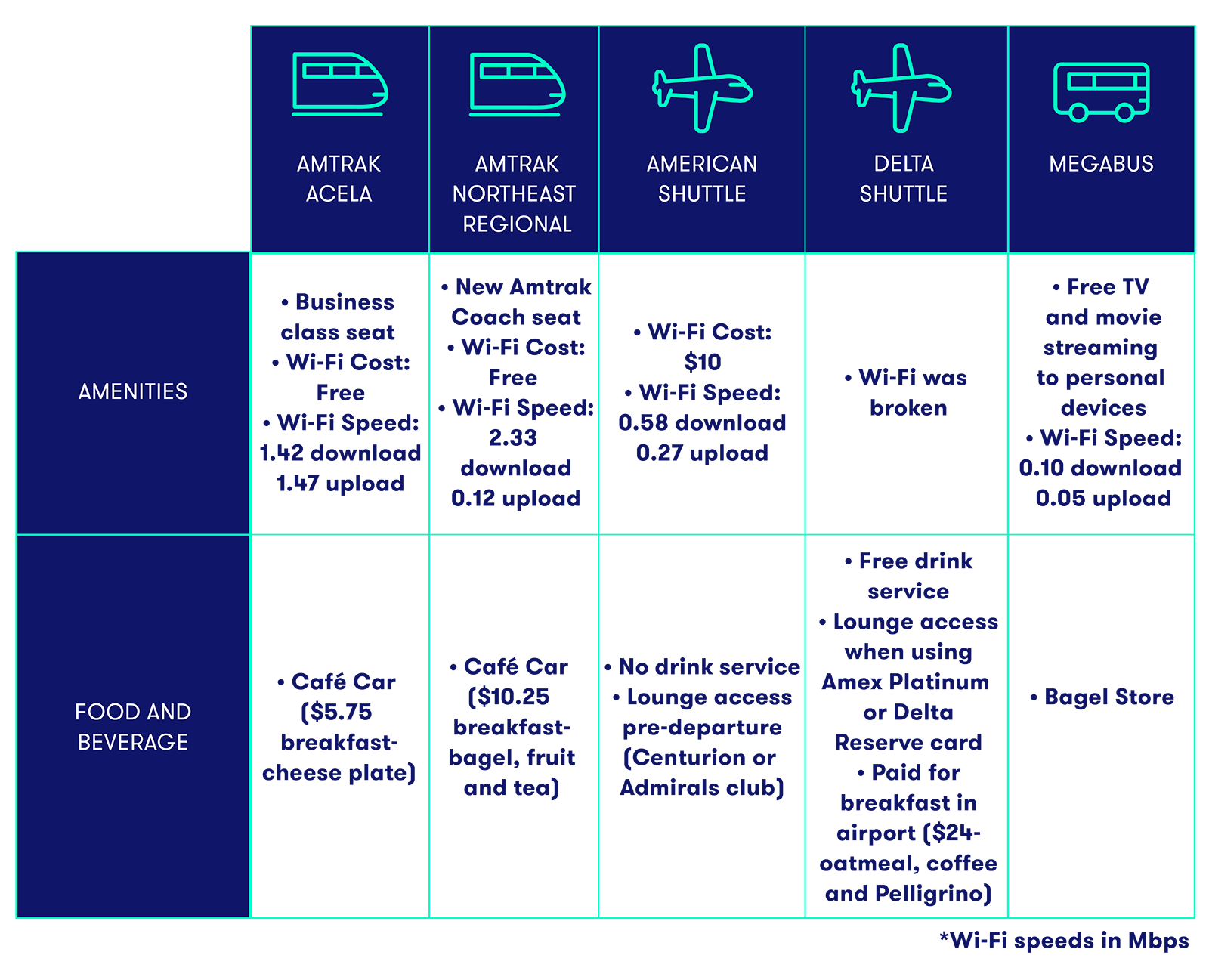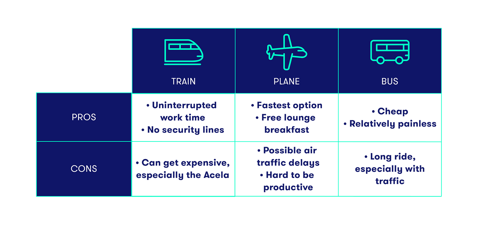 Train: While the trains were slower than the flights, they afforded a nice long, uninterrupted block of time to work or relax. Trains are generally much more reliable than flights, as they aren't subject to air-traffic delays. If you aren't pressed for time, you can even score a deal on the Northeast Regional by booking a few weeks out.
