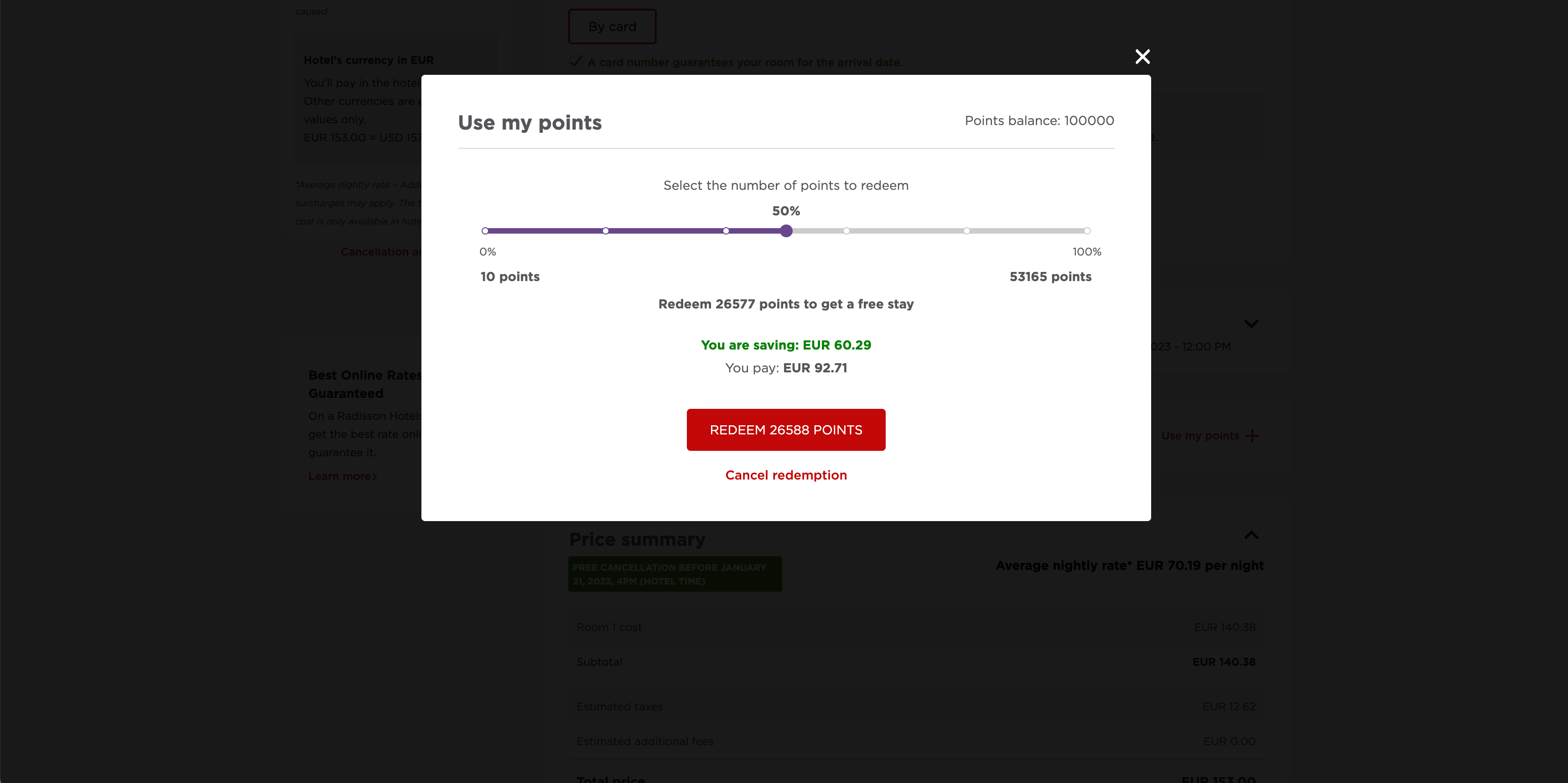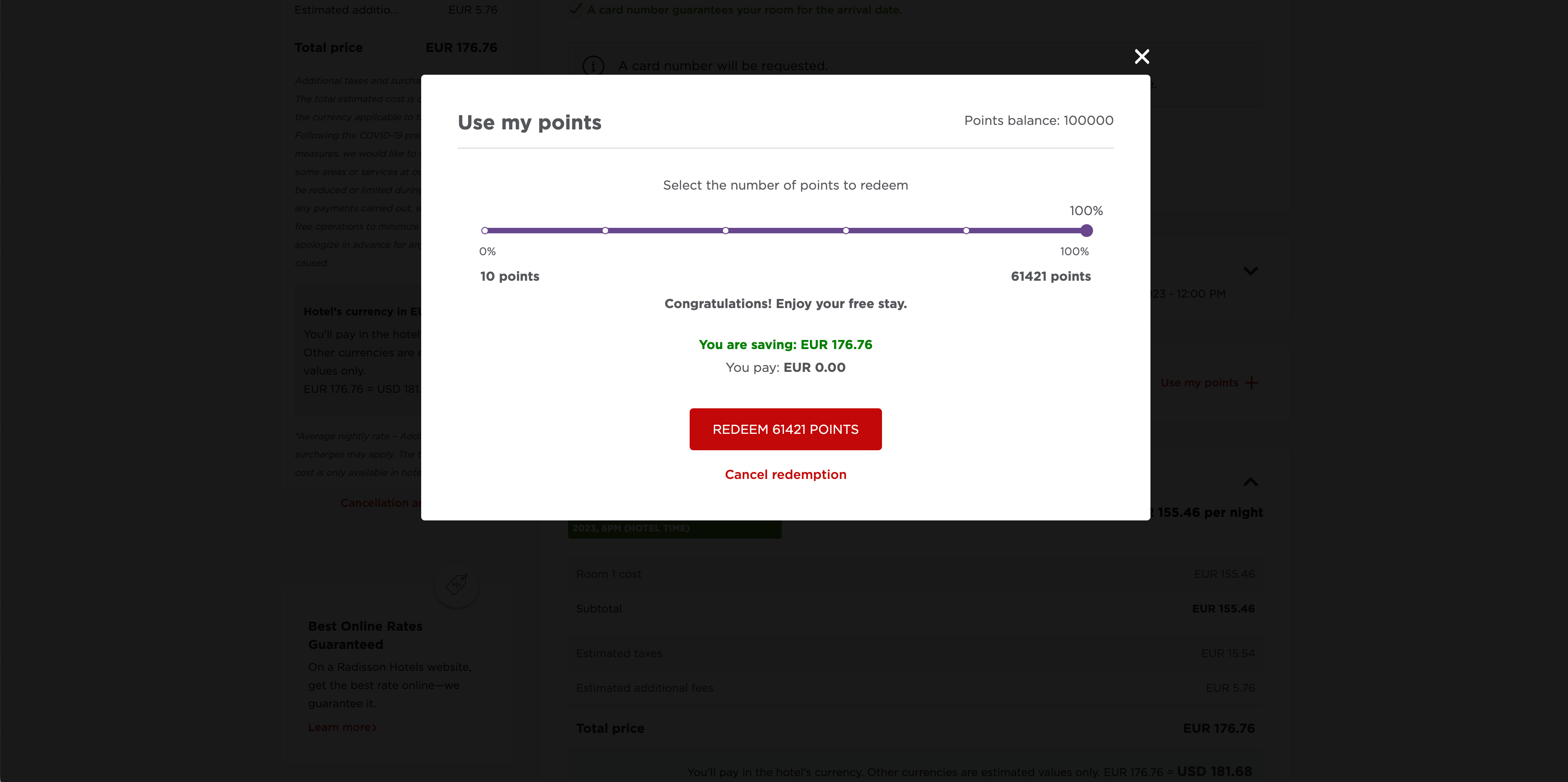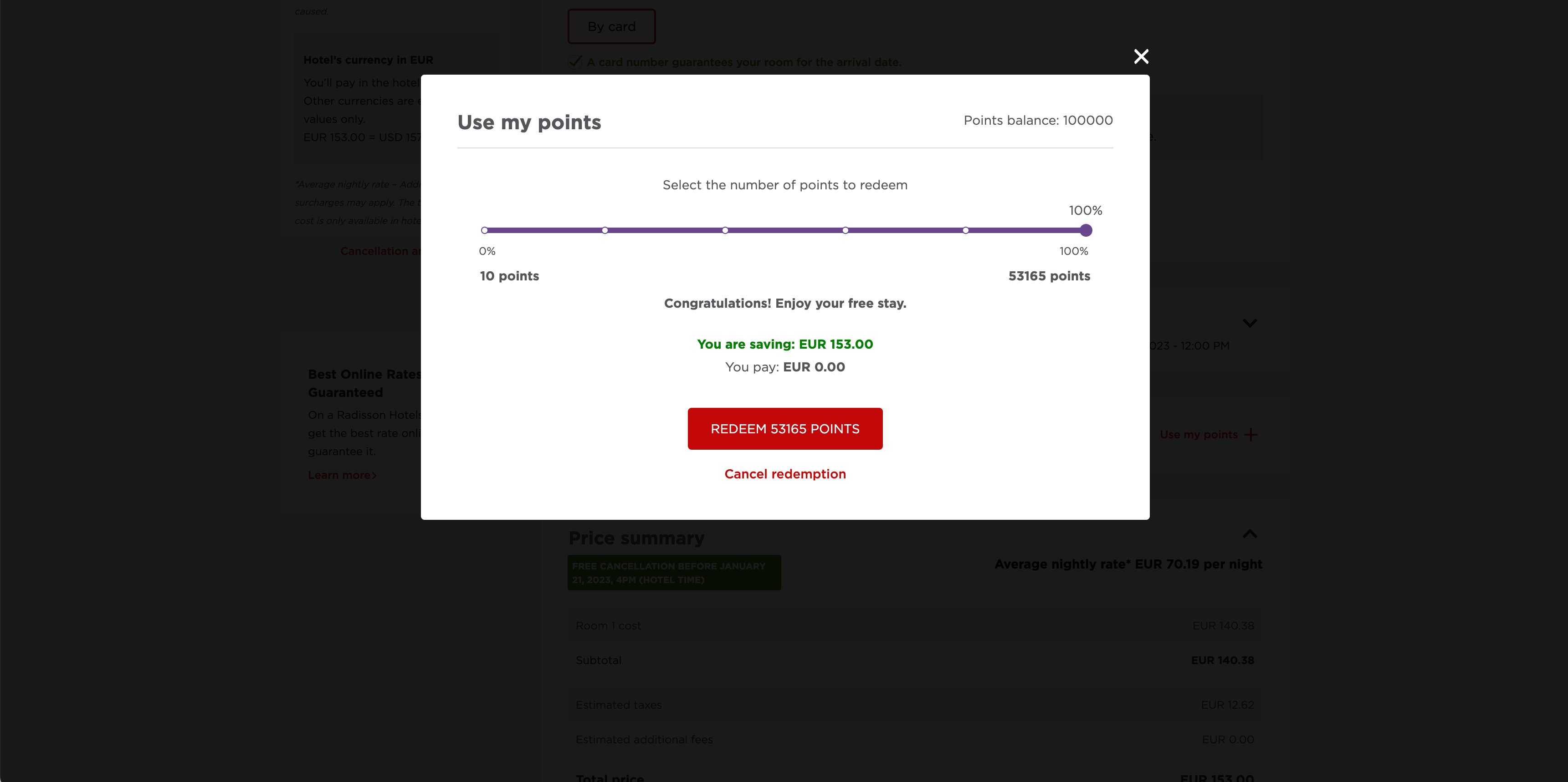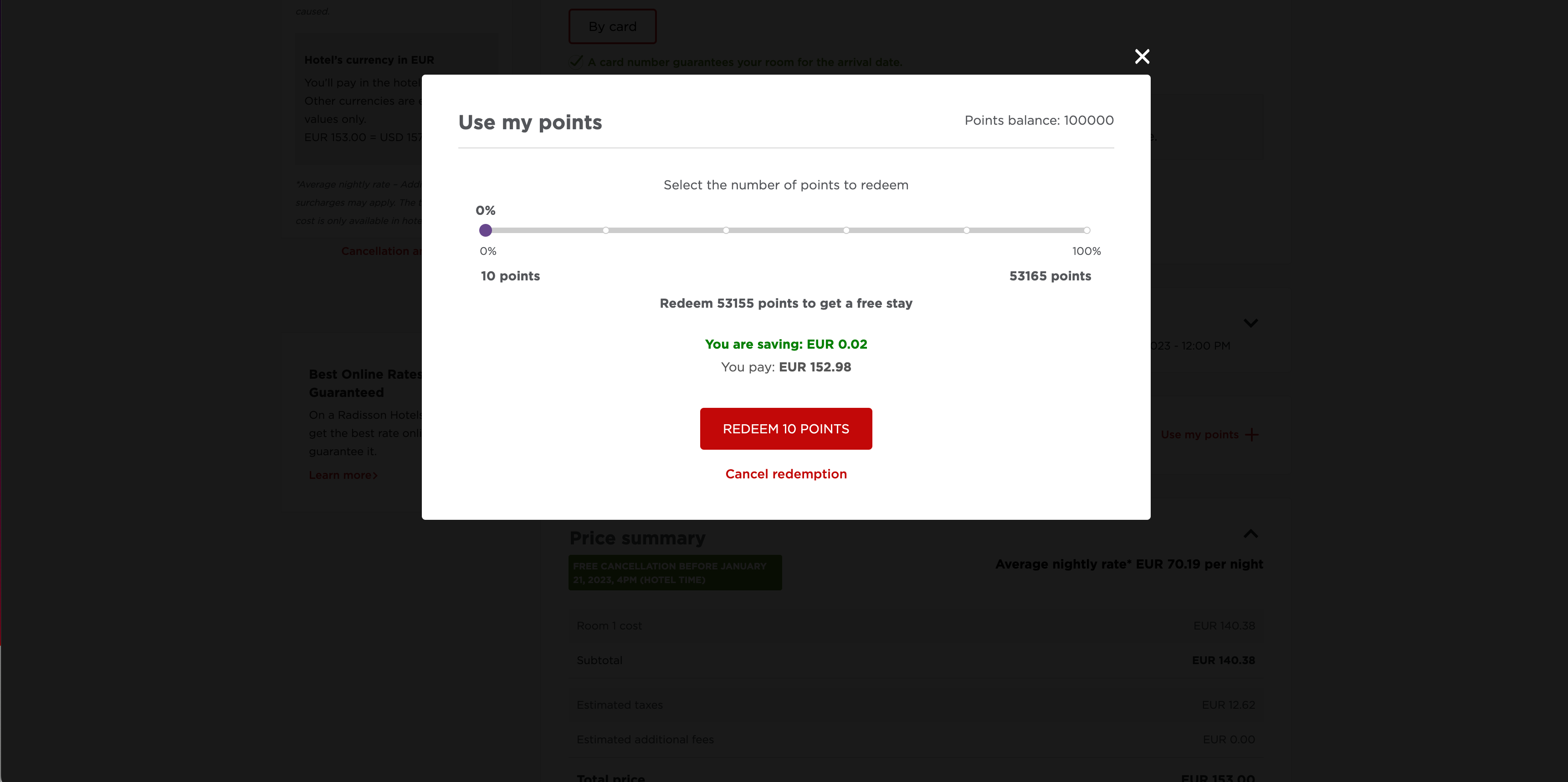 I also tried booking a two-night stay at the Park Inn by Radisson Central Tallinn in Estonia in January 2023 with a coworker's account that was stocked with 100,000 Radisson Rewards points. The cash rate was $150.38 for the stay. When using the minimum of 10 points, the cost dropped by $0.02.